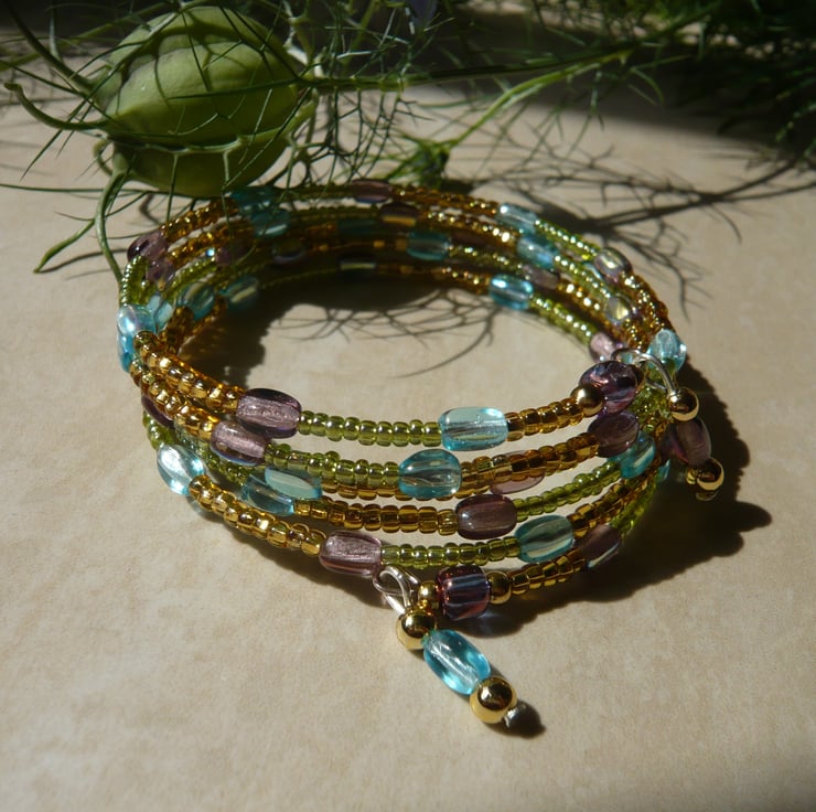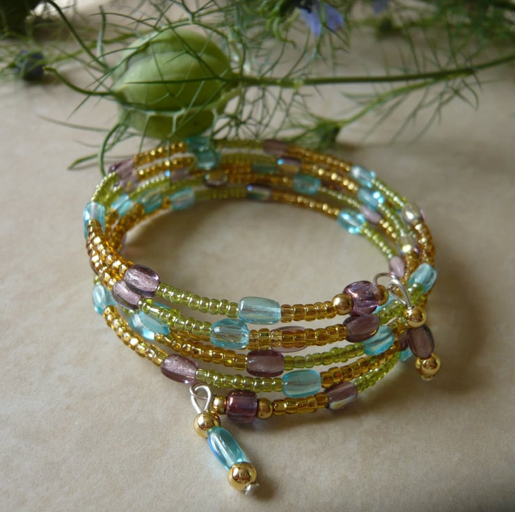Hi, This bracelet is made from just over 4 full coils of memory wire with stunning colours of aqua, lilac gold and lime green seed beads. There are two little droplet beads at each end to add a feature.