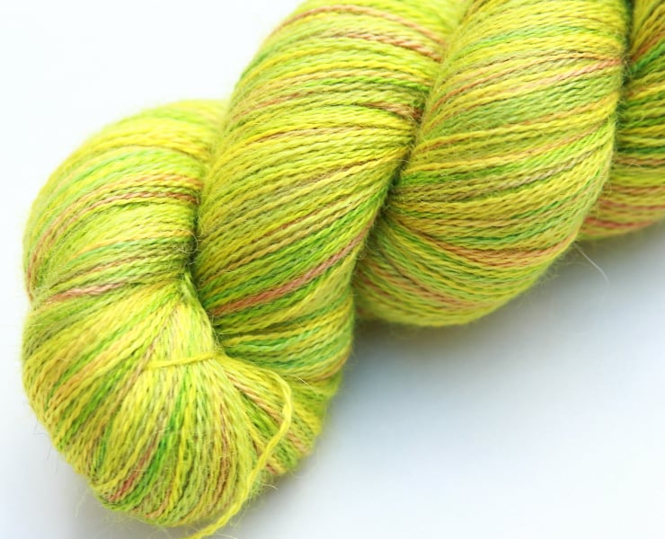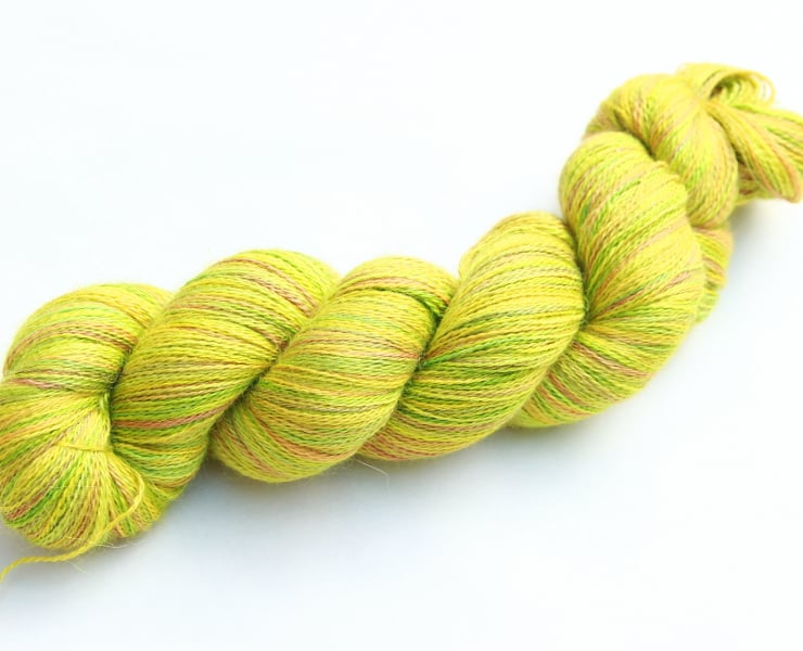 Cheery yellow and lime green with hints of tan (the metaphorical harvest mouse darting amongst the crop). This gorgeous and luxurious yarn has the softness and warmth of alpaca with the smooth sheen and cool feel of silk. It should make beautiful lace projects. Photographs have been taken and edited in bright natural light.