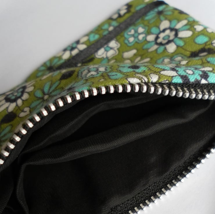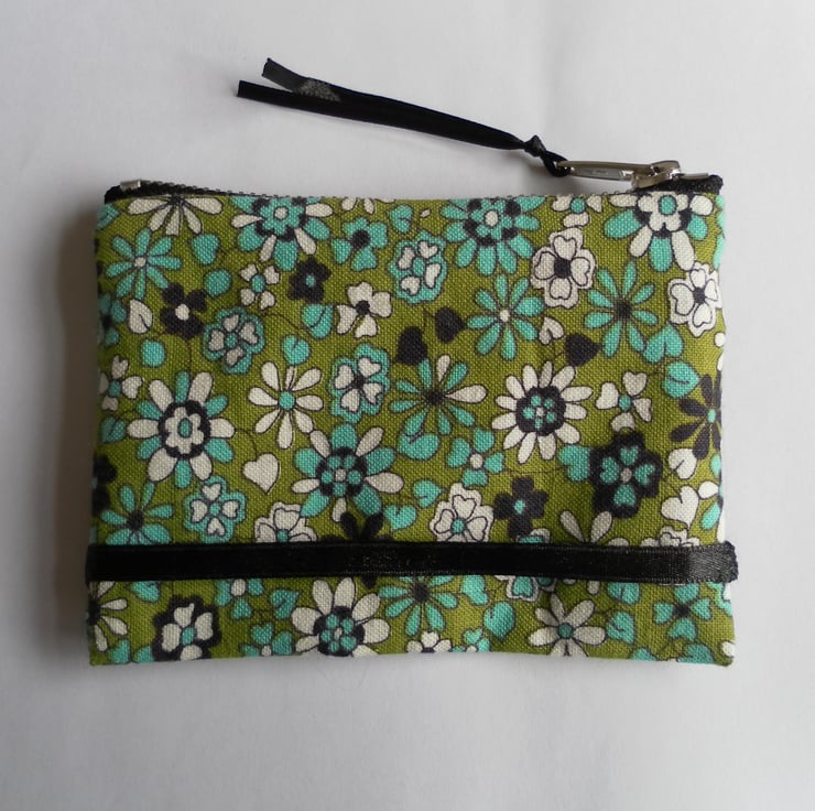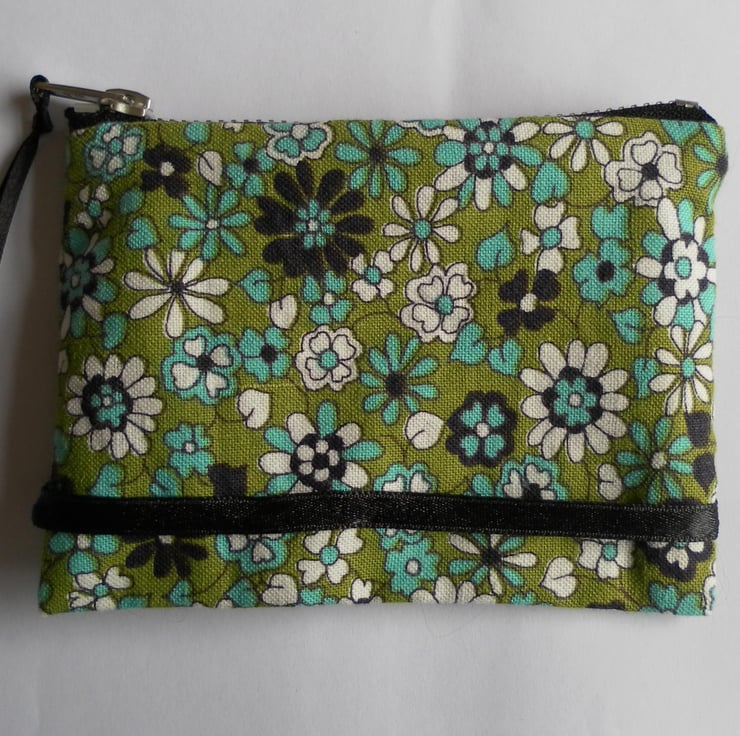 This pretty and useful zipped purse is made from green, turquoise, white and black floral cotton fabric with a black satin ribbon trim. Fully lined with black china silk, the purse has two partitions, giving three inner compartments. (12 cm x 9 cm) This purse matches other items in my shop.