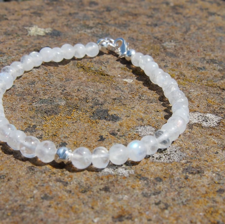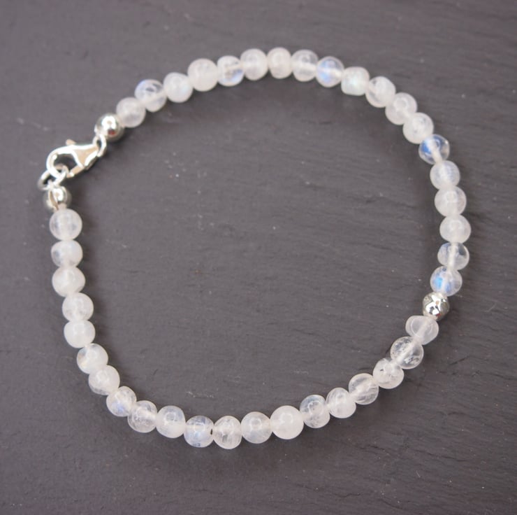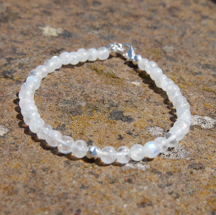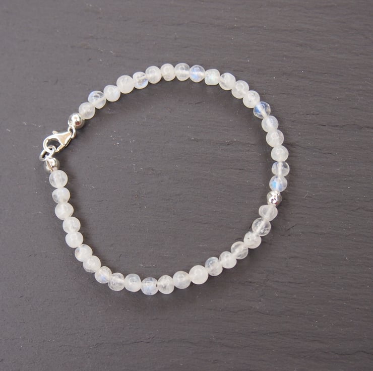 Delicate, simple bracelet of small (4mm) "blue" moonstone beads with an accent of a sterling silver nugget bead, and a small sterling silver clasp with silver heart attached (not shown in the photos as I added it later!)