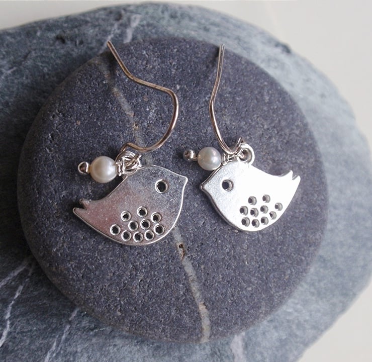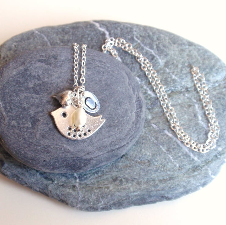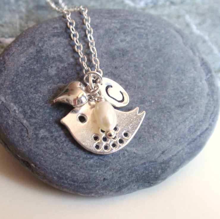 Pretty Silver plated bird personalised necklace with a freshwater pearl, personalised initial charm and silver plated heart.