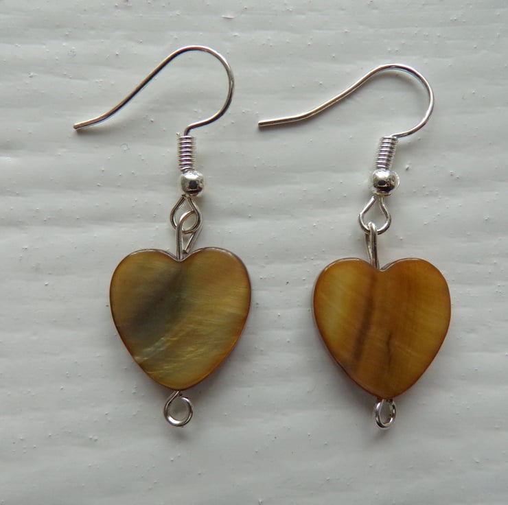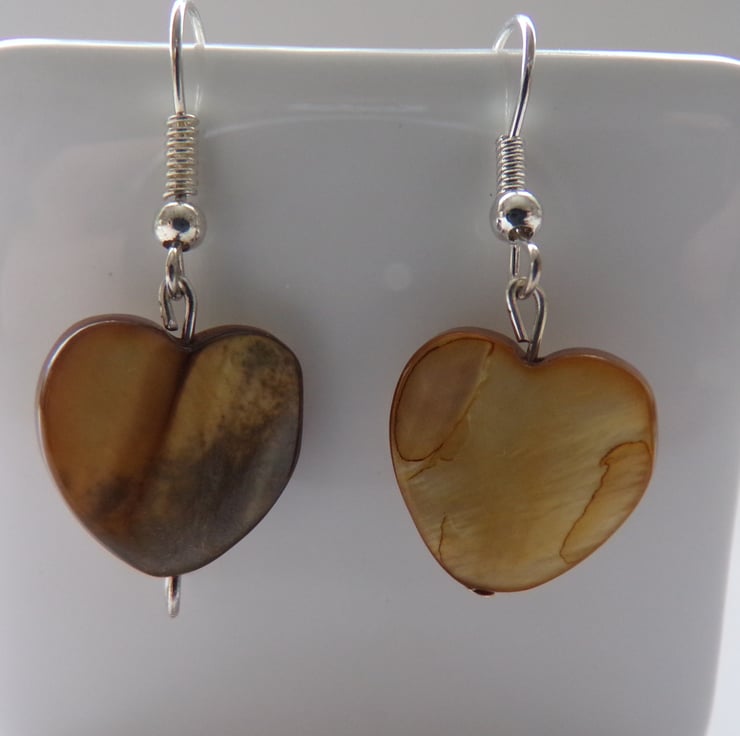Beautiful Shell Heart Earrings. Brown coloured hearts measuring approximately 15mm on hypoallergenic, nickle-free, silver plated ear-wires, perfect for sensitive ears.