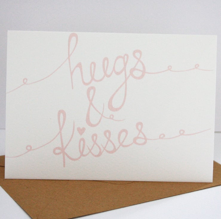 Pretty pastel pink, hand lettered hugs and kisses card.