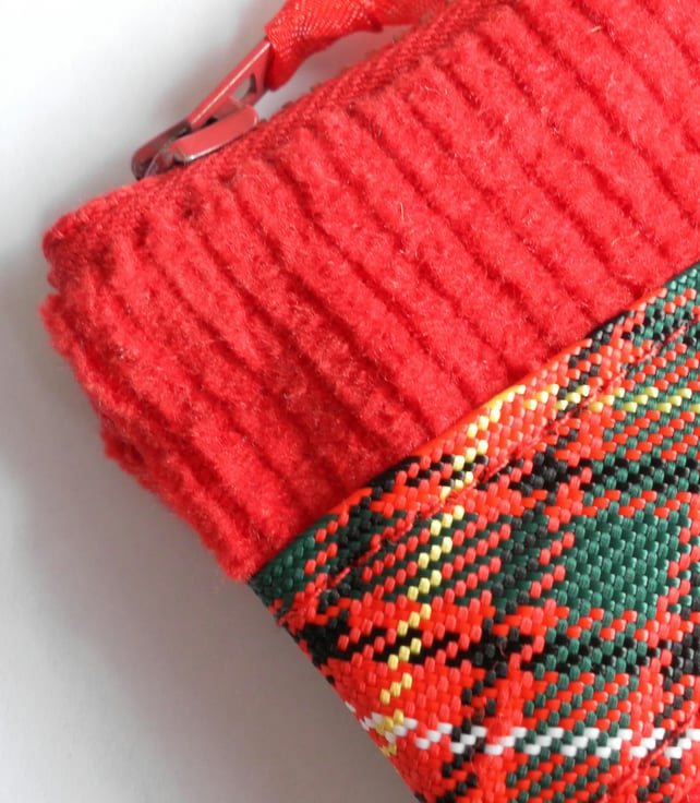 This stylish and elegant glasses case is made from red corduroy, trimmed front and back with woven tartan ribbon. It has a red button and handmade loop closure, is lightly padded and lined with black china silk. (17cm x 9cm)