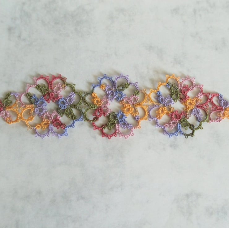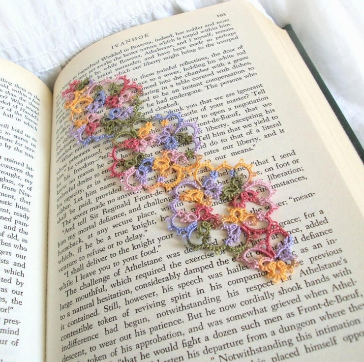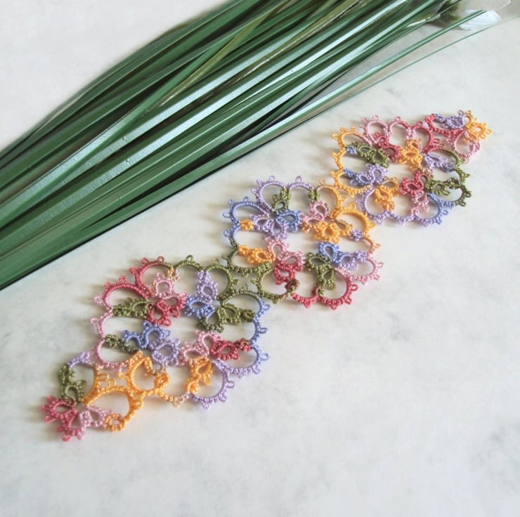 This feminine, lacy bookmark was carefully shuttle tatted in high quality multicoloured cotton thread (a lovely mix of blue, green, lilac, pink and yellow).