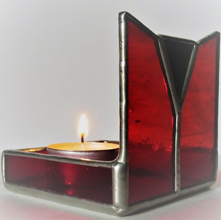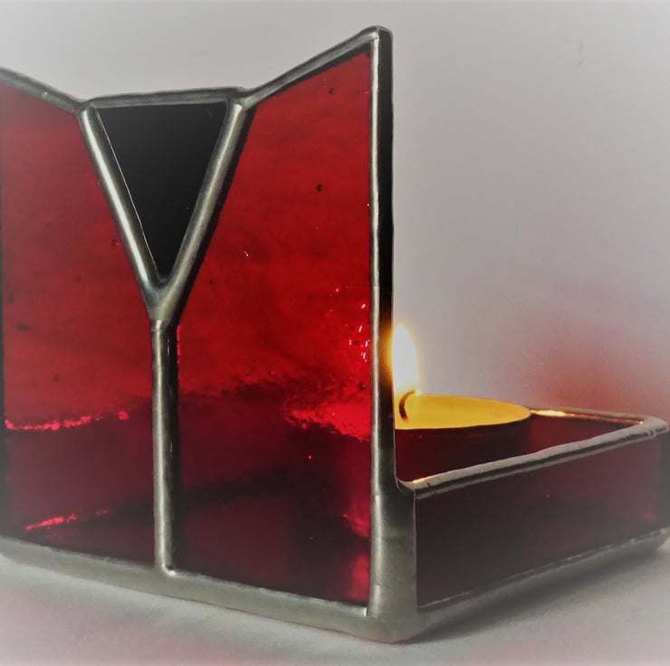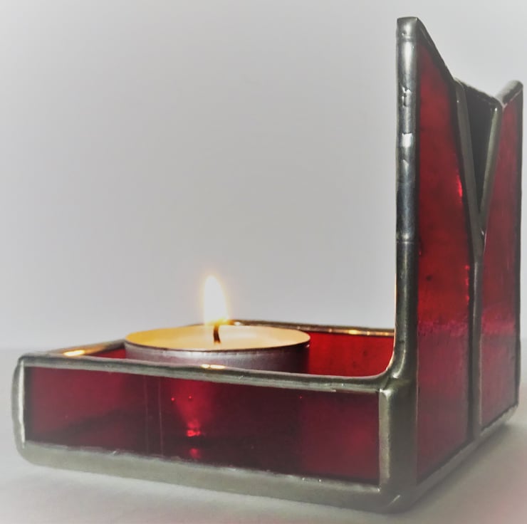 Tea Light holder in the Art Deco style. I have used Cerise Ruby Kokomo Restoration glass which is a lovely vibrant red glass and contrasted this with a piece of Black Opal glass in the centre. The Tea Light holder is elegant with clean lines and will bring warmth and colour to any room. It is an ideal gift for any occasion. Tea Light candle included.