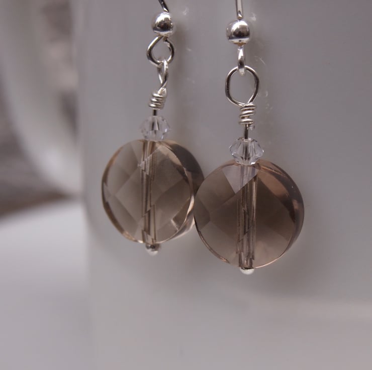 Simple and elegant drop earrings of facetted smoky quartz, with a tiny crystal on top, and sterling silver ear wires. The facetted surfaces of the quartz reflect the light beautifully.