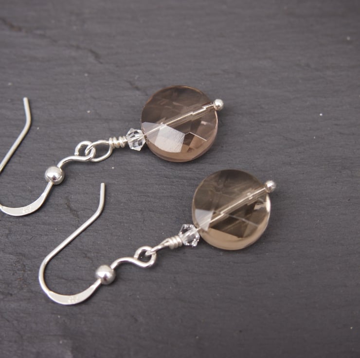 Simple and elegant drop earrings of facetted smoky quartz, with a tiny crystal on top, and sterling silver ear wires. The facetted surfaces of the quartz reflect the light beautifully.