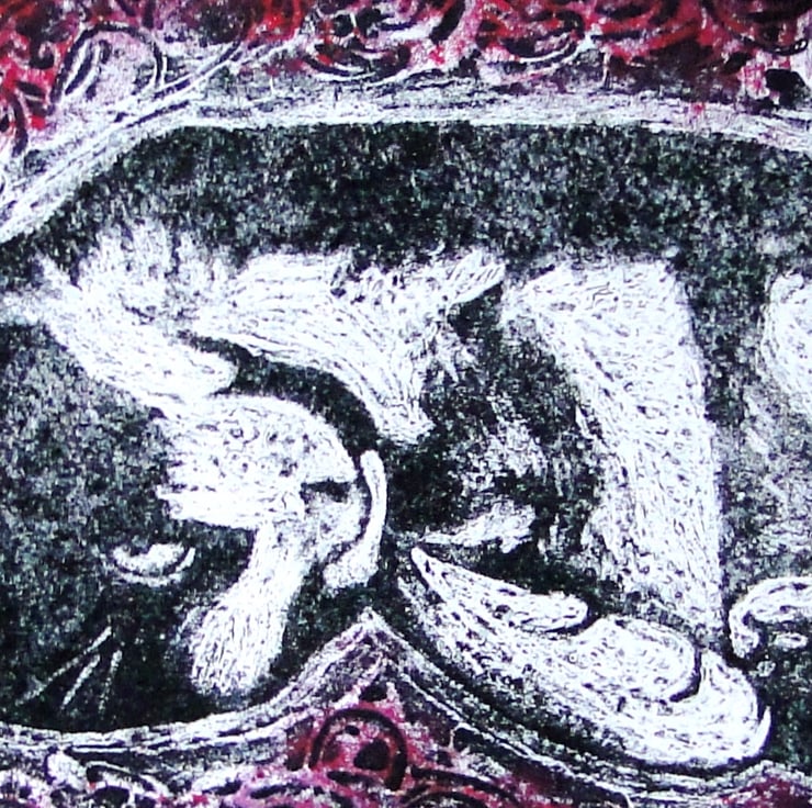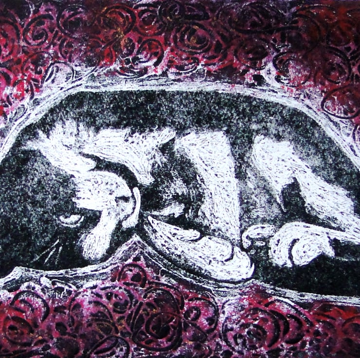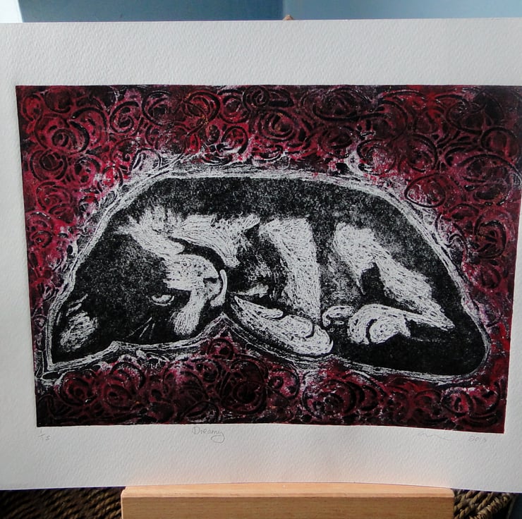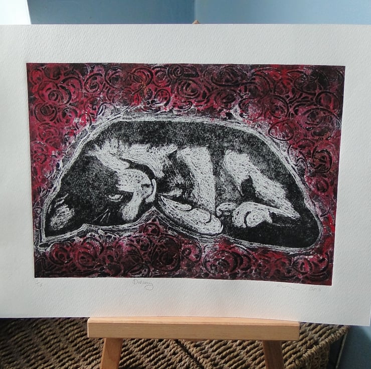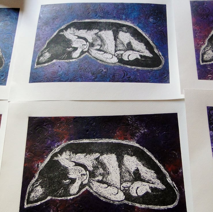 Hand printed on 300gm acid free watercolour paper in purple/black oil based ink with coloured background. Each one has a slightly different colour background.