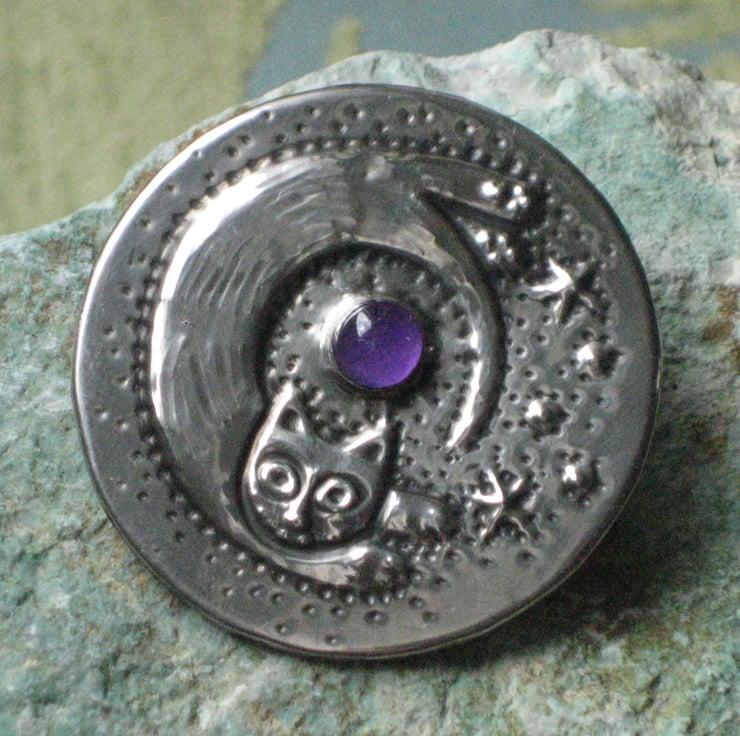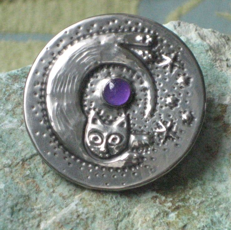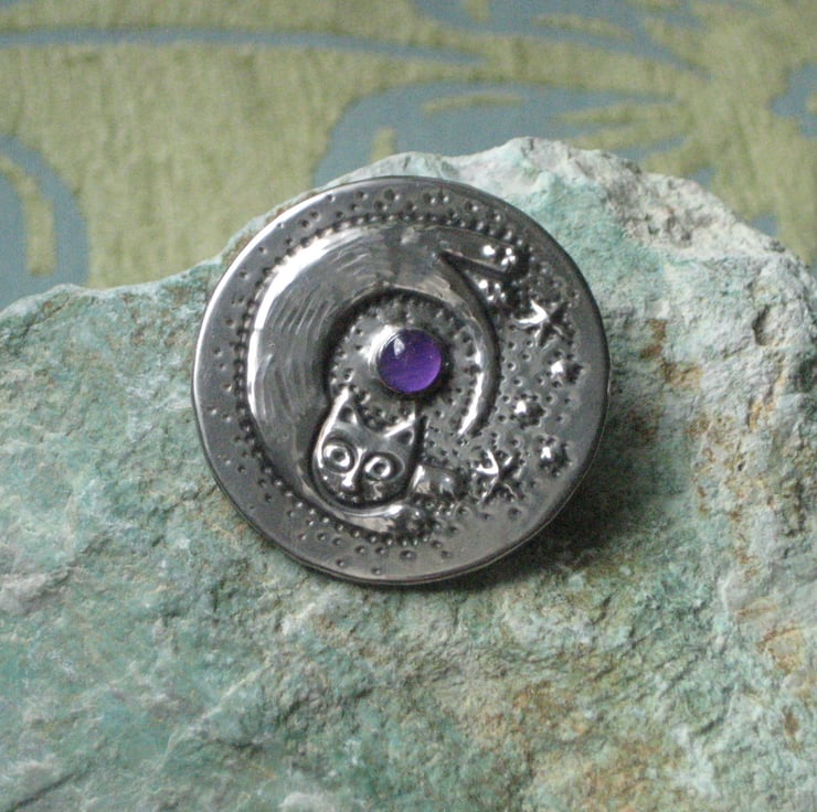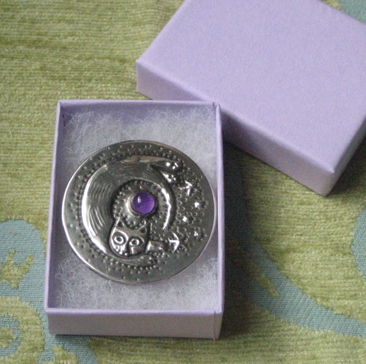 This brooch has been hand-made in shiny modern pewter, and features a genuine amethyst cabochon. It measures 40mm,1.5 ins across and has a 30mm pin with safety catch on the reverse. Comes gift boxed (may differ from that shown). A great gift for a 10th Wedding Anniversary, Mothers' Day, Valentine's Day, Christmas or Birthday.