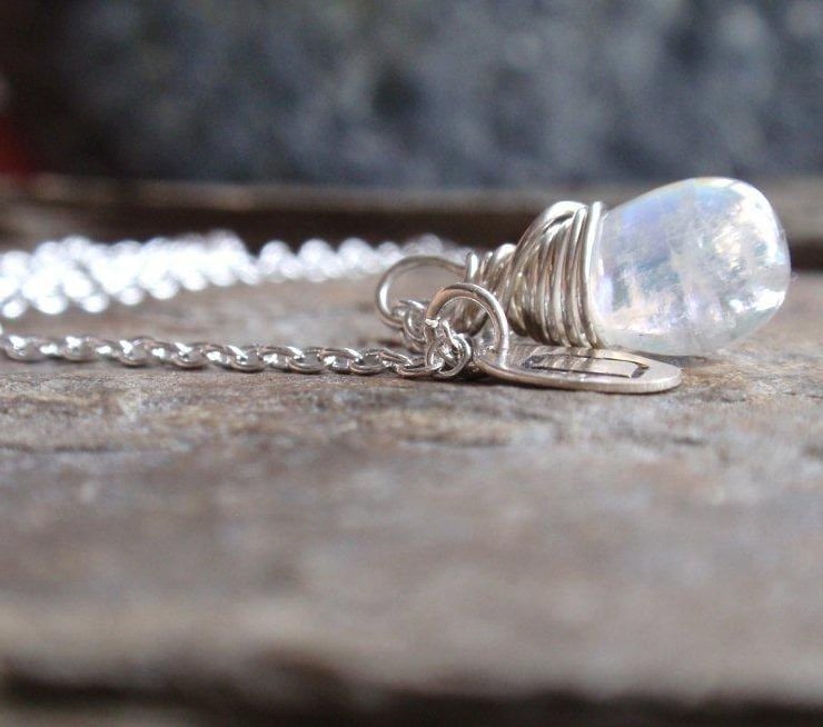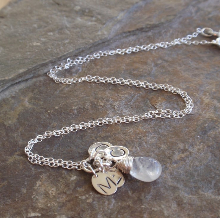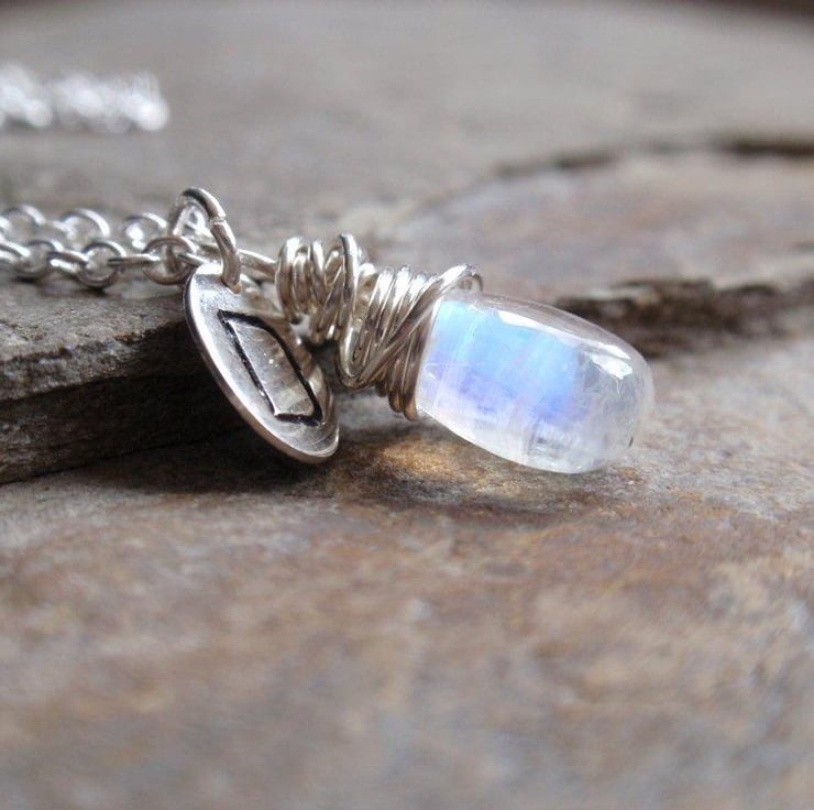 it is made from a sterling silver wire wrapped moonstone and a sterling silver hand-stamped personalised initial.The 8-9mm rainbow moonstone is a smooth teardrop briolette, messy wire wrapped by hand in sterling silver wire.