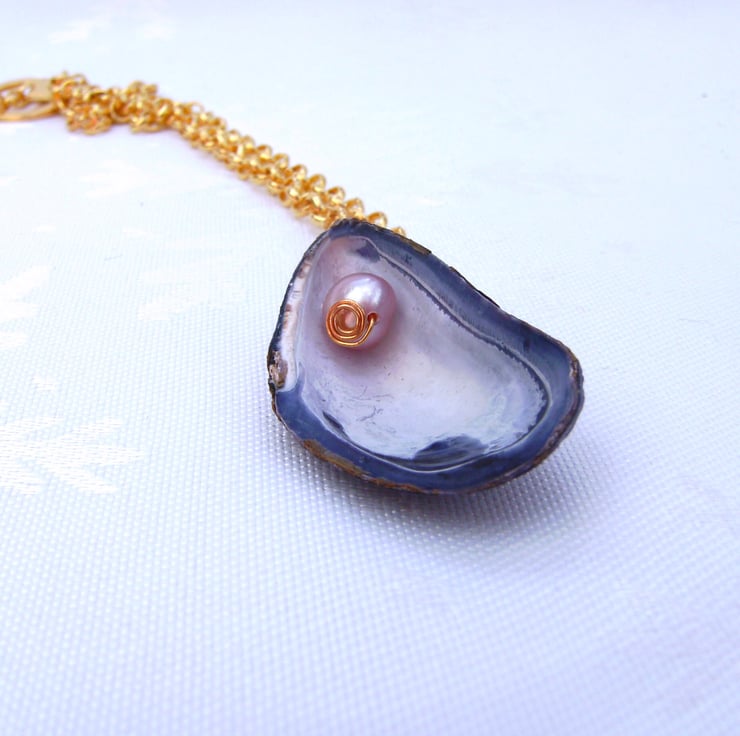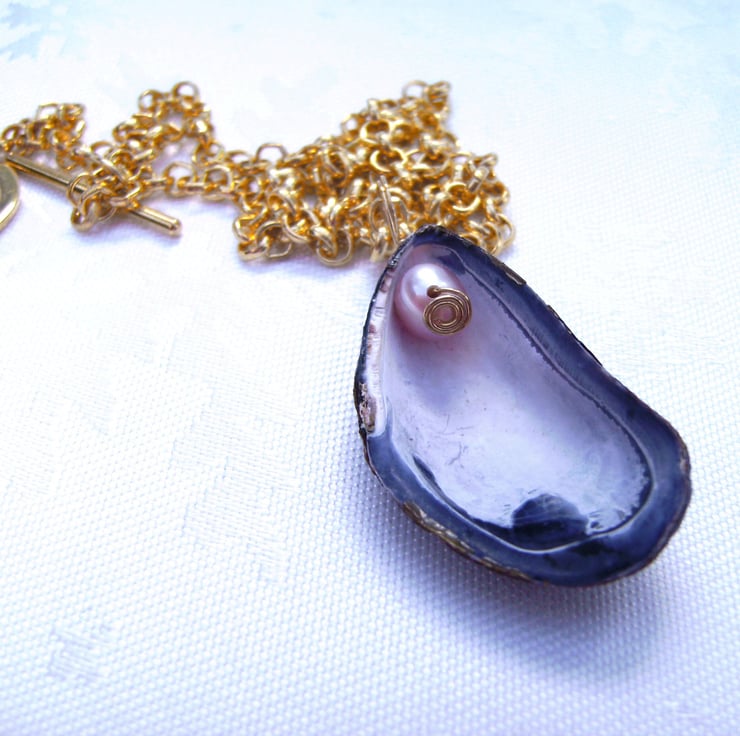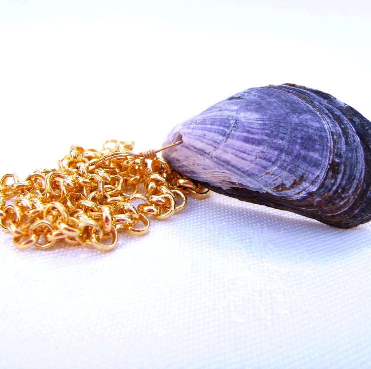 This unique necklace has been handcrafted using a natural mussell shell ( measures approximately 3.5 x 1.5 cm) from the west coast of Cumbria. It has been cleaned & drilled & a 5mm freshwater potatoe pearl added, using gold plated wire. It is hung on a 17.5 inch gold plated chain, completed with gold tone heart toggle clasp.