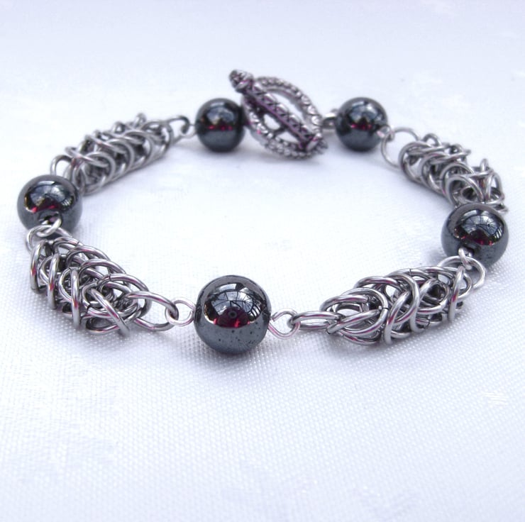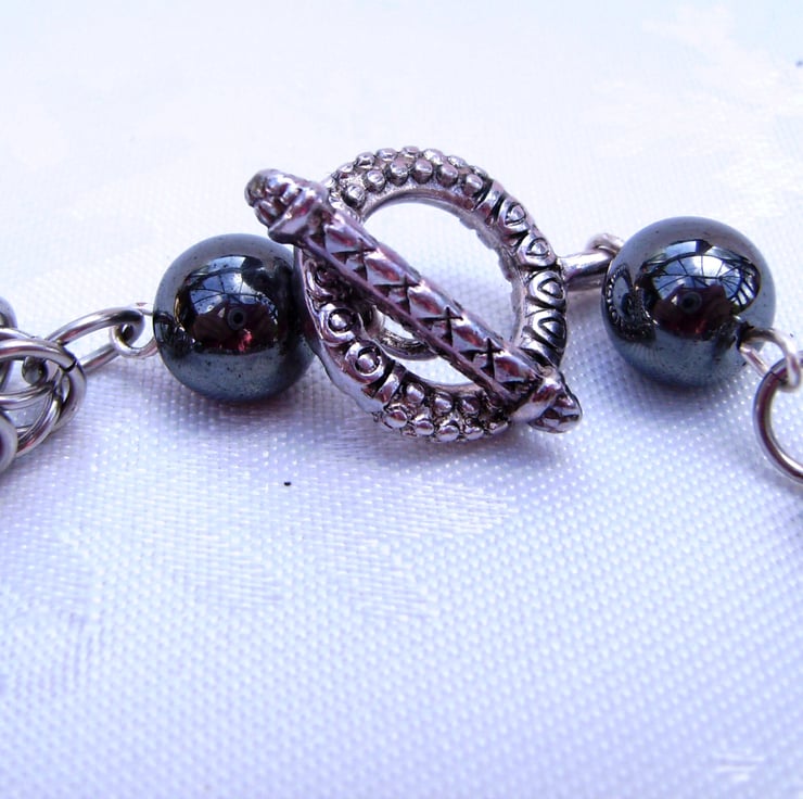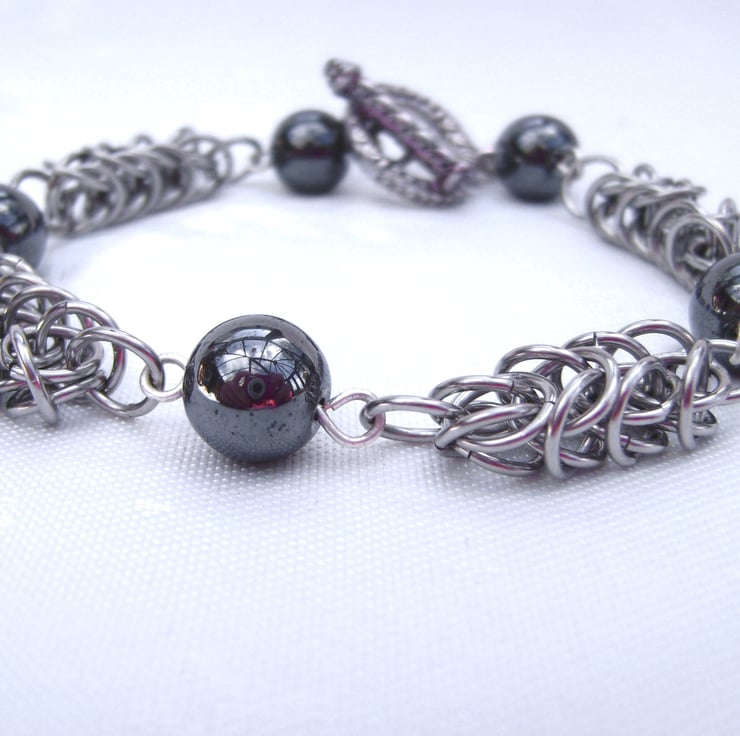 This chainmaille bracelet has been created using steel jump rings & 10mm black haematite beads, giving it noticeable weight. It would be suitable for a man or woman. It measures 8.5 inches but can be easily customized to fit, just send me a message or email