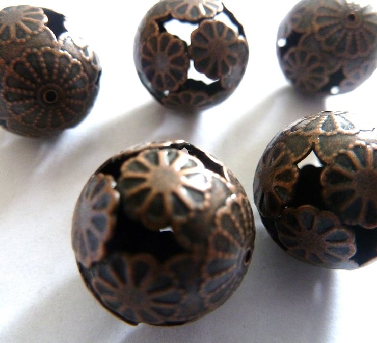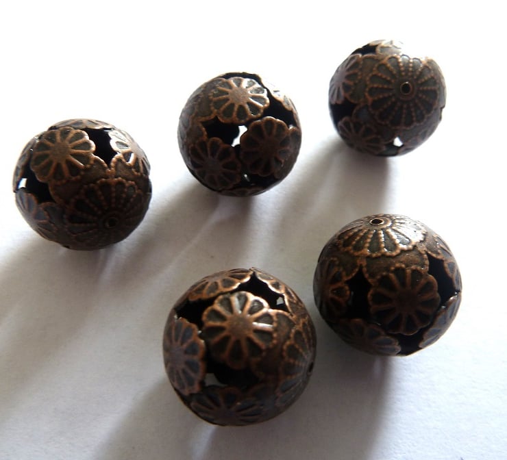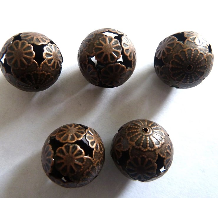 A set of 5 copper tone filigree ball beads.