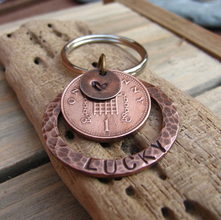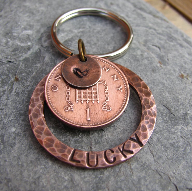 This lucky one penny keyring could bring you luck! Made from a large copper washer that has been textured, stamped and aged. A real penny has been drilled an added with a tiny heart charm. approx 3cm in diameter.