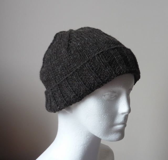 This guys' hat can be worn with rolled edges or as a slouchy beanie. It is made of a thick yarn of 63% new wool and 37% acrylic, making it hard wearing.