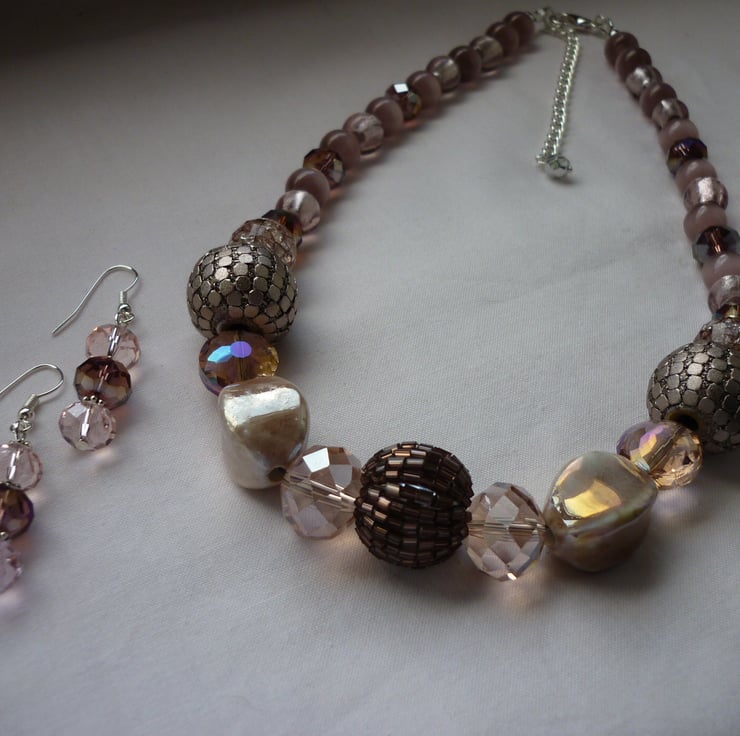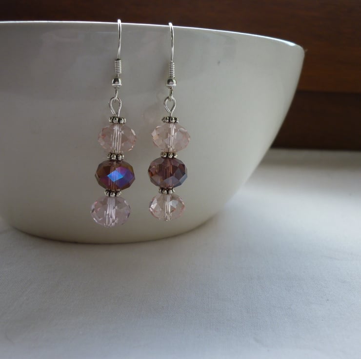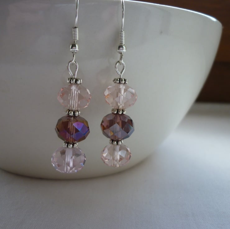 THE EARRINGS HAVE BEEN MADE WITH FACETED GLASS HANDCUT RONDELLE BEADS IN SHADES OF PALE PINK AND AMETHYST WITH BRONZE LUSTRE, SILVER PLATED DAISY SHAPED SPACER BEADS AND FINISHED WITH SILVER PLATED NICKEL FREE EAR WIRES.