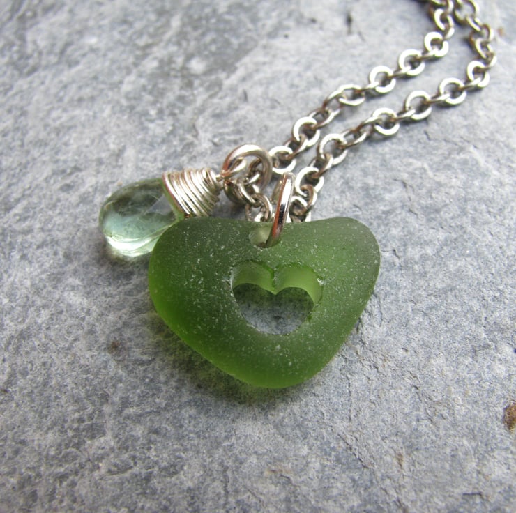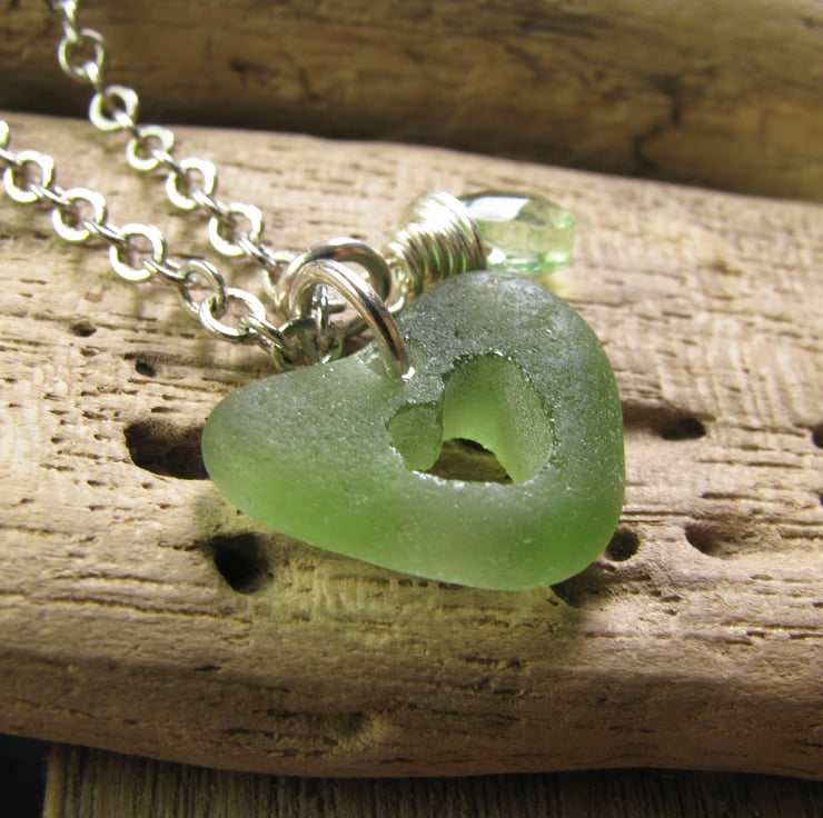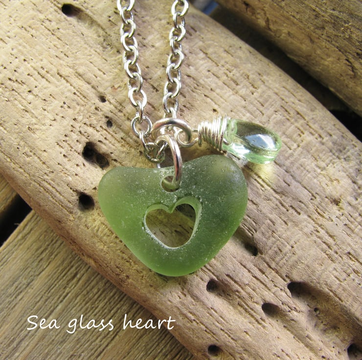A natural dinky sea glass heart with a carved out heart within and a little pale green crystal bead. On a silver tone chain 16"