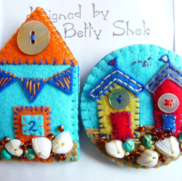 This is for a sunny seaside inspired beach hut design felt brooch that I used tiny shells, turquoise, shell button and tiny beads to light up the pin that I individually designed and handcrafted.