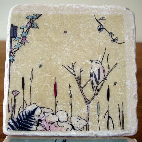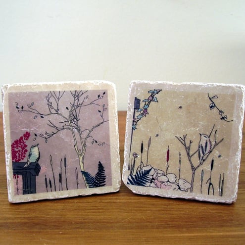 A pair of natural stone coasters each decorated with an original littlebirdy design.