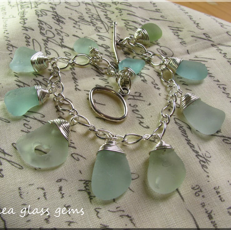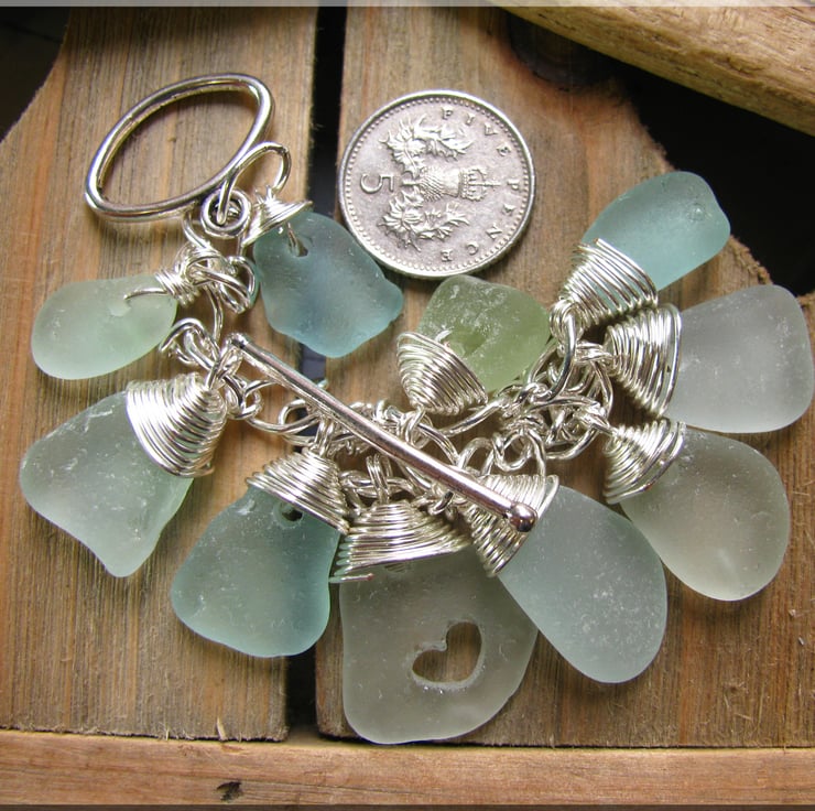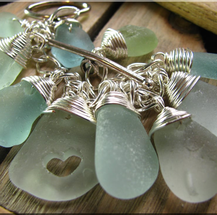 A charm bracelet made with gorgeous seafoam, aqua and pale green sea glass hand wrapped in silver plated wire, and attached to pretty silver-plated chain. A carved out heart lies within one of the charms. Finished with a toggle clasp. Measures approx 8".