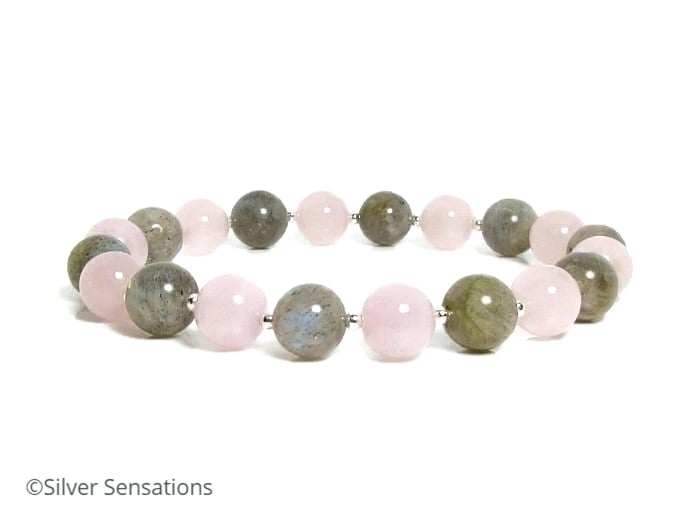 Romantic Rose Quartz teamed with iridescent Labradorite make a wonderful & eye catching combination.