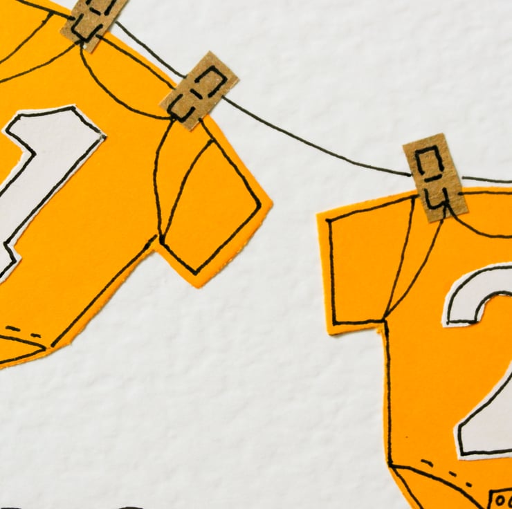 Each part of the items on the line, including the tiny pegs is hand cut and they are then individually attached on top of the background. Then mounted to the card giving it a textured and slightly 'raised' appearance.I then draw around the image and hand write the greeting.