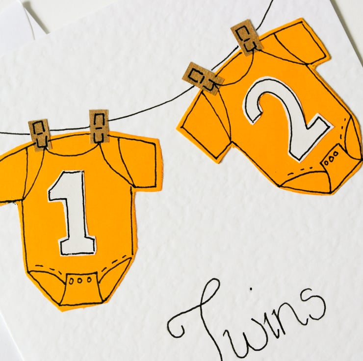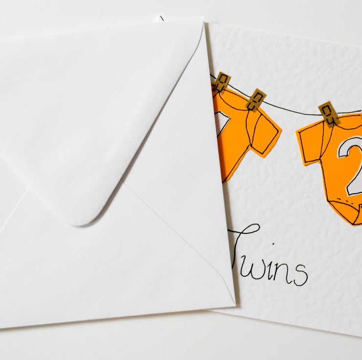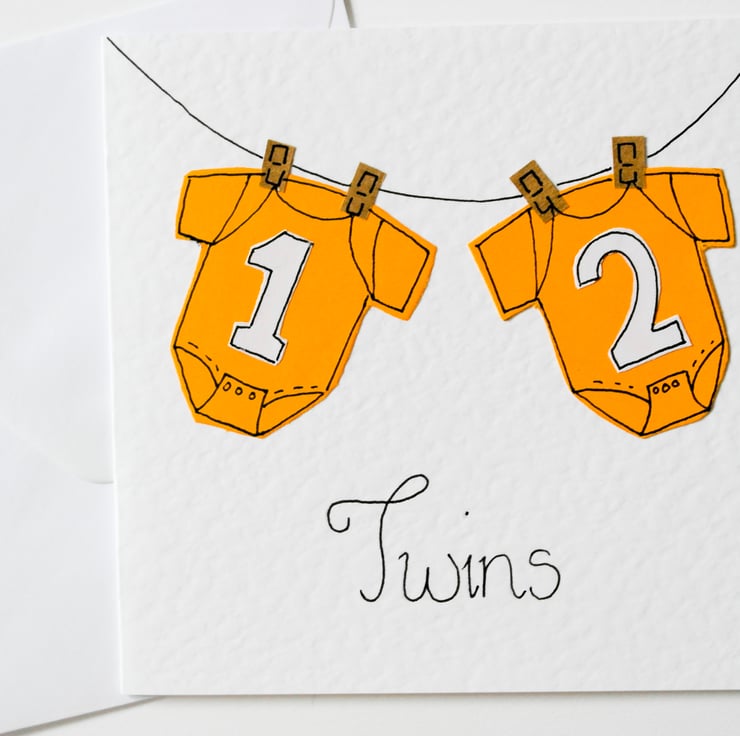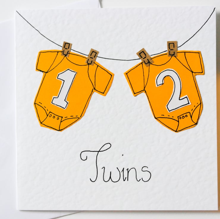 A special Handmade Greeting Card to send to celebrate the birth of Twin Babies. A perfect image of two cute baby grows hanging on a line. The yellow is perfect for twins, whether it be two boys, two girls or one of each. I think all new parents can relate to this image of new baby clothes Hanging on a line. The card is blank inside to give you lots of room to write your own special message. This card is a great keepsake for the new parents.