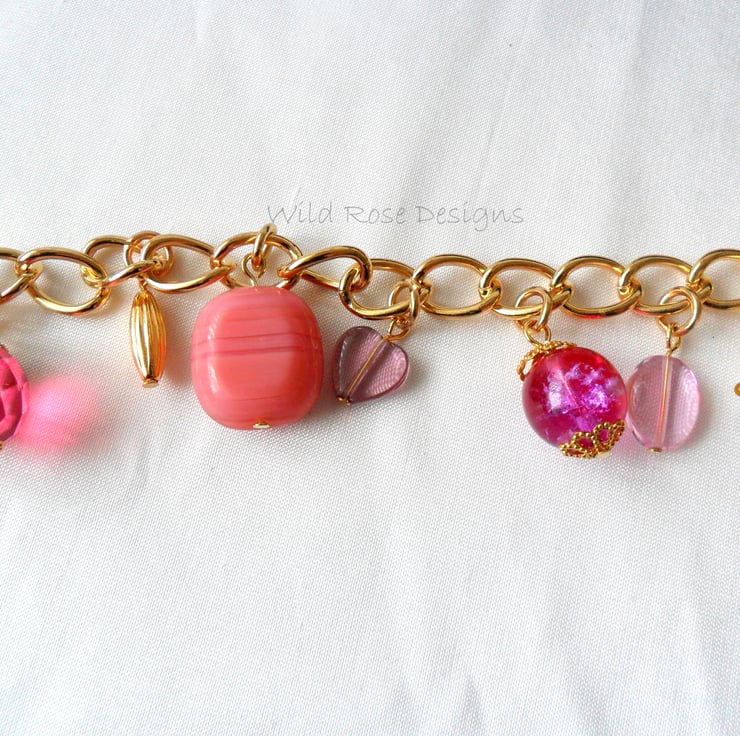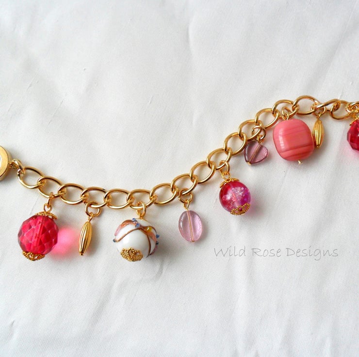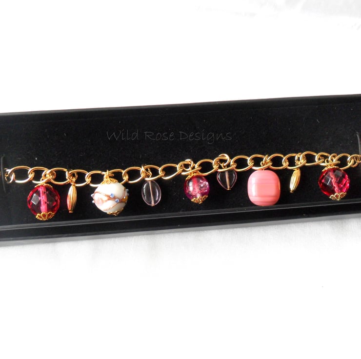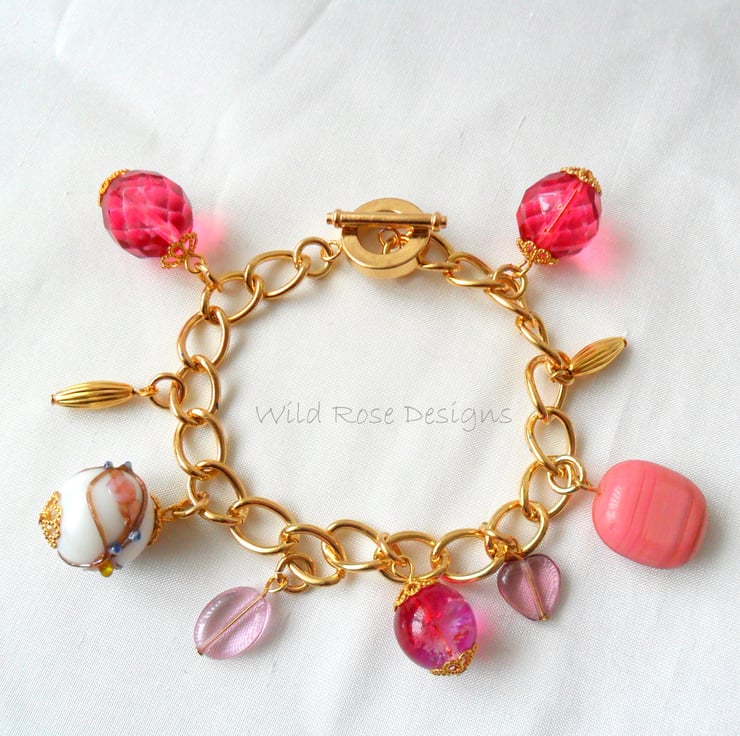 A beautiful handmade charm style bracelet with a selection of beads in shades of pink and gold suspended from a gold-plated bracelet. The largest of the glass beads is nearly 2 cm (3/4") in diameter and the bracelet measures 20 cm (8") long including the gold-plated toggle clasp.