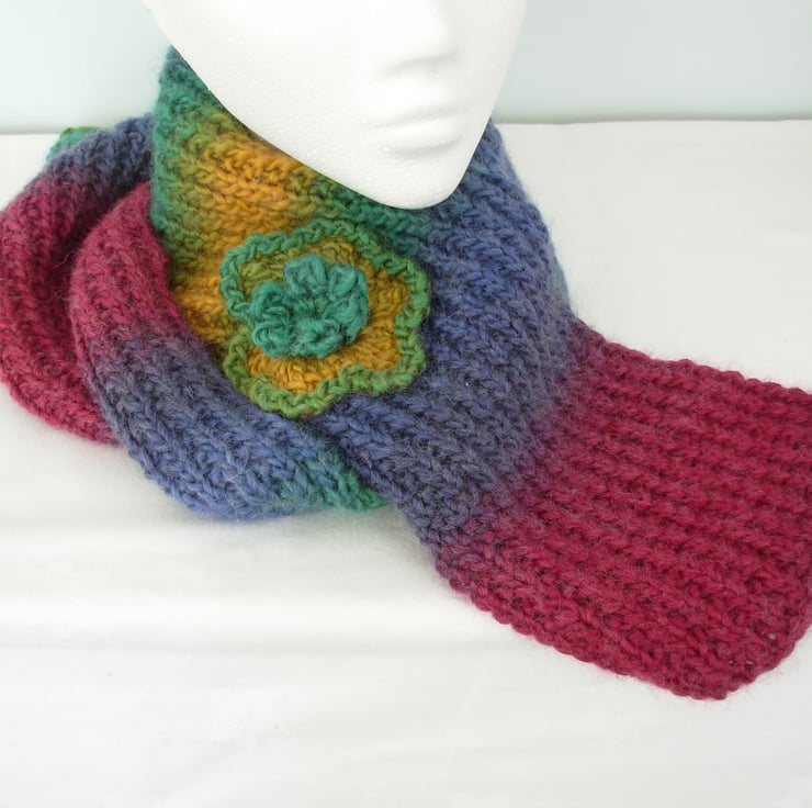 I've knitted this scarf in King Cole Riot graduated chunky 30% wool and 70% acrylic yarn and finished it with a crochet flower. It is beautifully soft and warm for the coming winter months.
