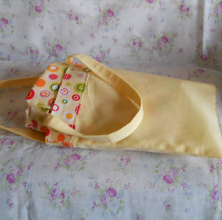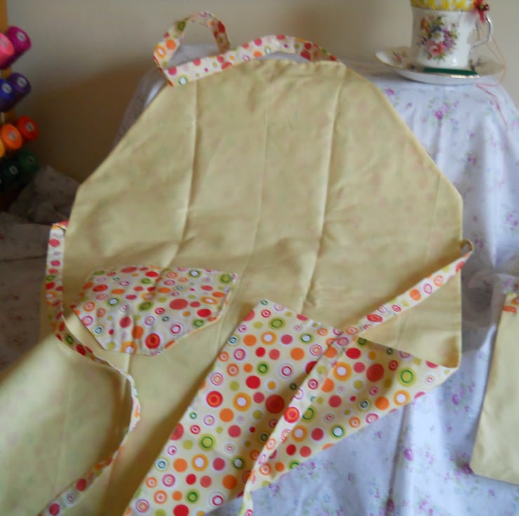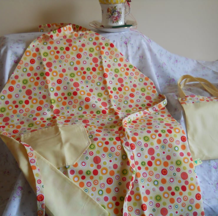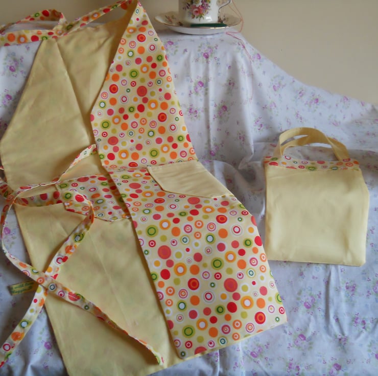This is a delightful child's reversible apron in bright and cheerful coloured fabric. One side is coloured spots, the main colour being orange. The reverse side is in a bright yellow. The apron comes with its own carry bag. Sure to make make a little person smile.
