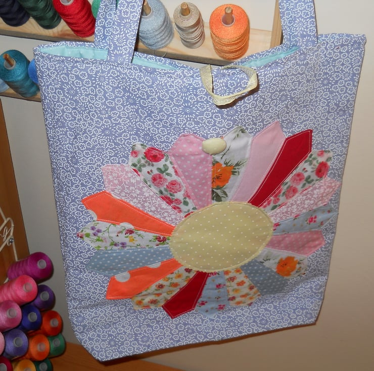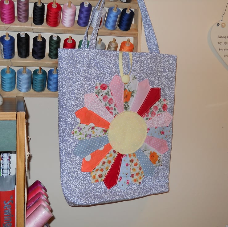 This is a gorgeous Tote/Book bag in a lilac ditsy flowered fabric. It has a patchwork flower on the front in shabby Chic multi coloured fabric. The bag is fully lined in a pale green spot fabric and has an inner lining of soft batting. It fastens on the front with a fabric covered button. The measurements are as follows: 16.50 inches X 14.00 inches.