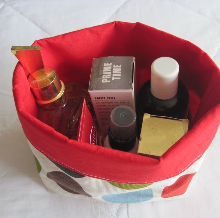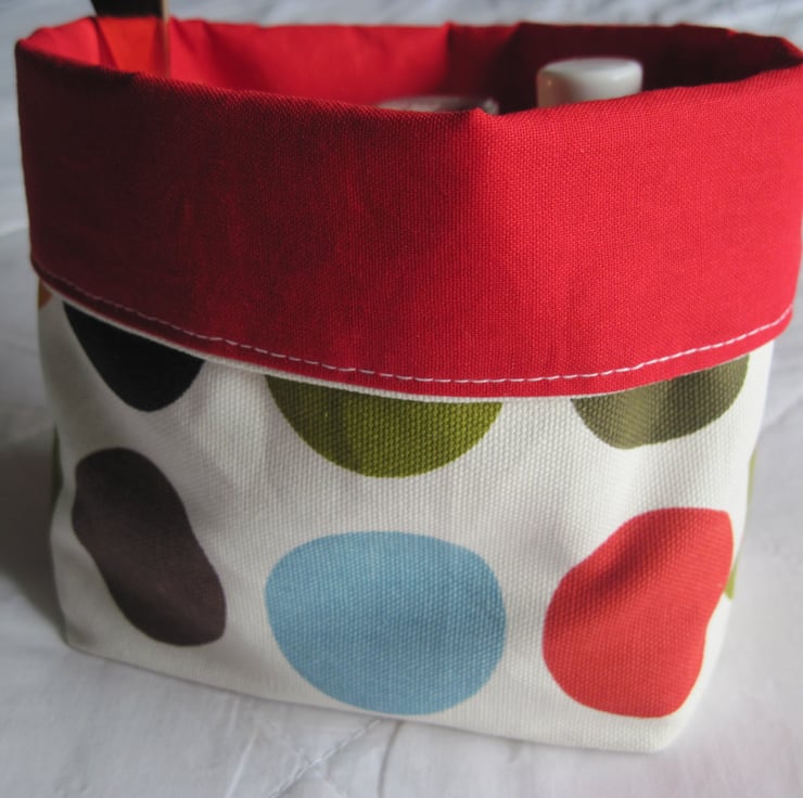Made from a beautiful medium weight outer spotty cotton fabric and interlined with a washable stiffener to give it strength, they will last for a long time. The inner fabric is also from a medium weight bright red cotton fabric.