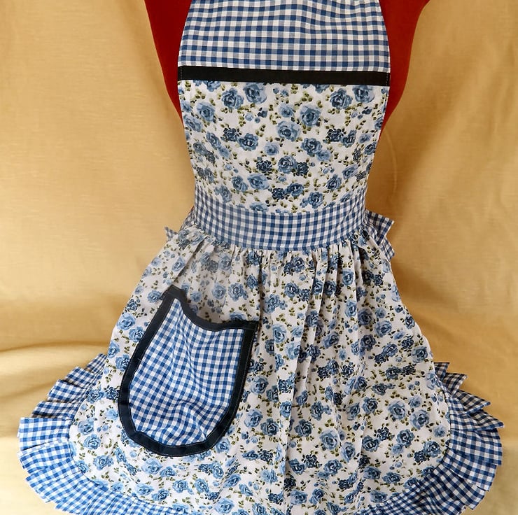 Here we have a lovely polycotton blue and white (roses) retro style full apron, handmade in house to our own design. (see photos). Adjustable neck and waist ties so will fit up to a size 22.