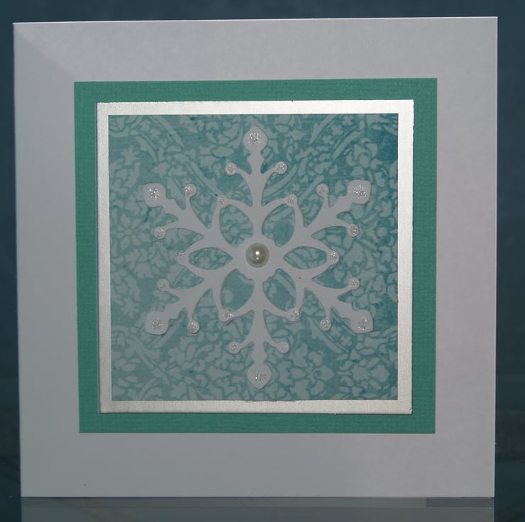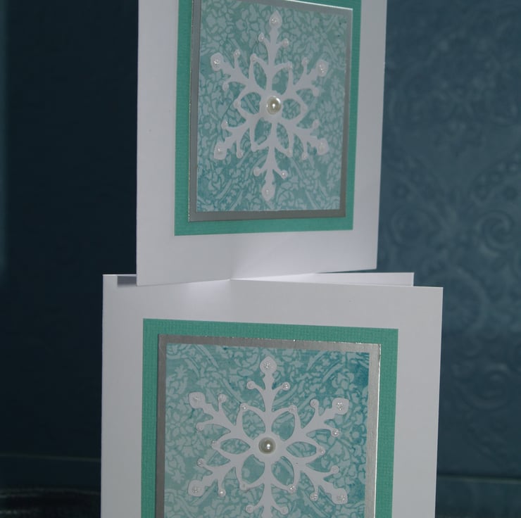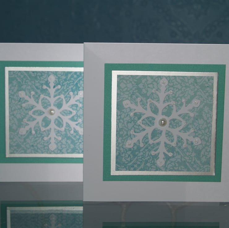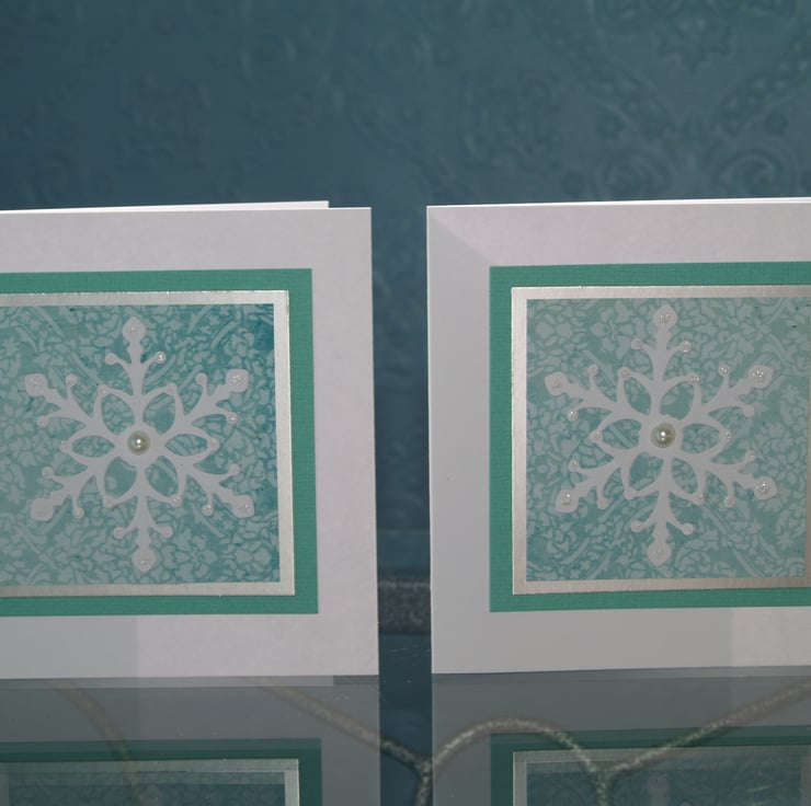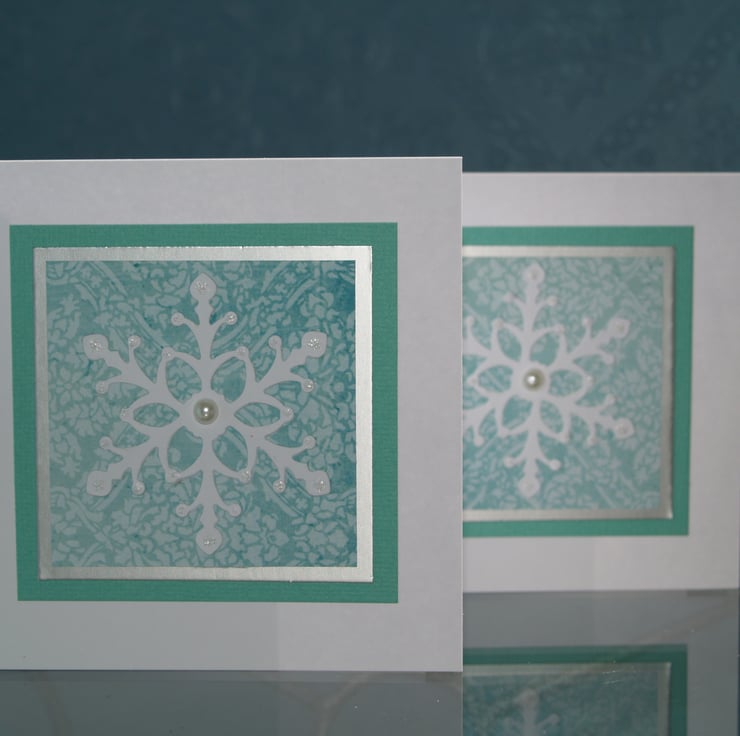 A pair of beautiful, individually made Christmas cards, each measuring 4 x 4 inches (10.2 x10.2cm).They depict a snowflake with a central pearl on an ice turquoise background and have been left blank inside for you to write your own message.