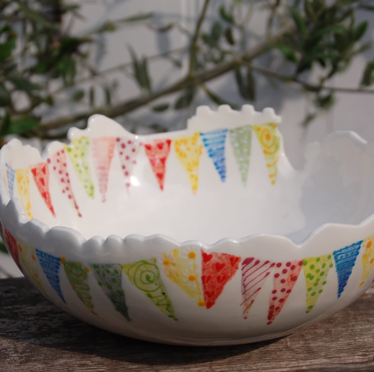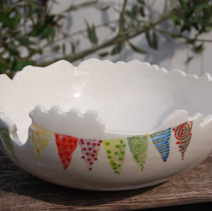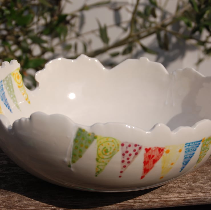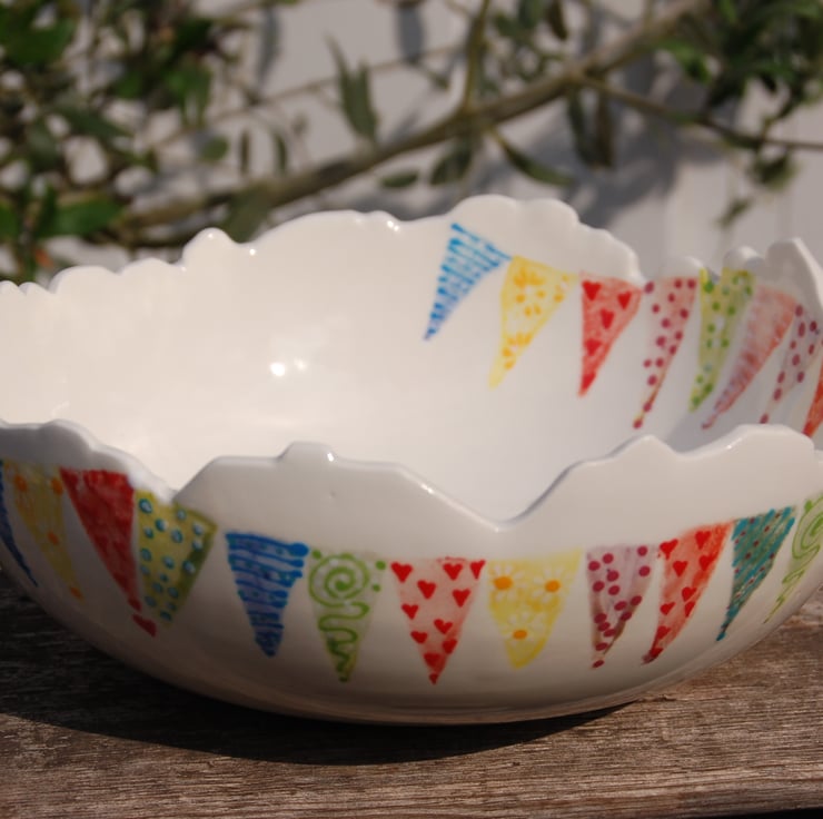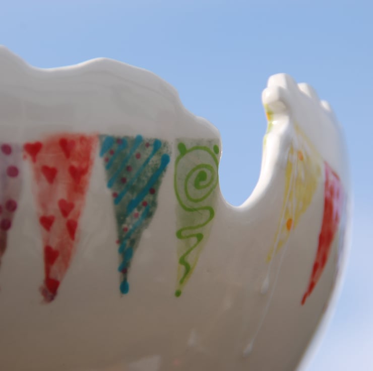 This is totally hand painted and utterly unique, each of my designs will vary slightly as they are painted individually using foodsafe underglaze colour. I have slip cast this footless bowl and cut the edge. The bunting is 'tied on' using thick colour and you can feel the 'string' under the glaze. It loops and flutters as if it has been blown about by the wind.
