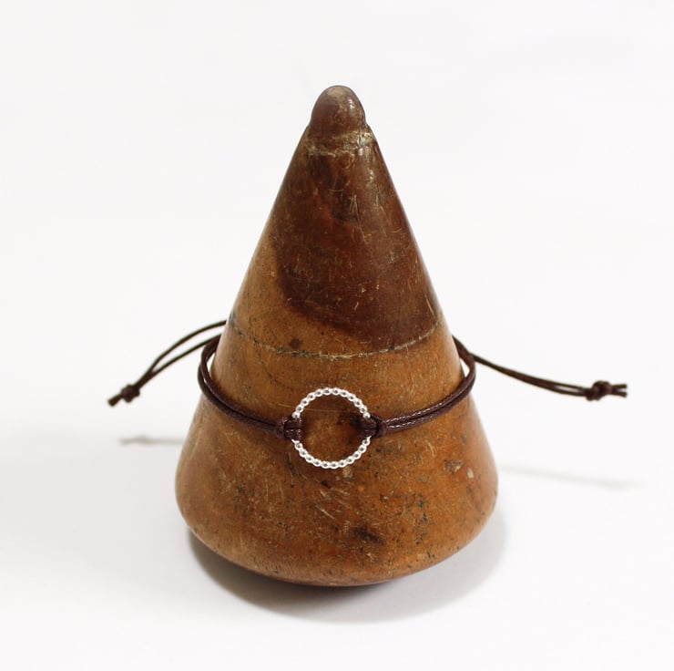 The circle is handmade from sterling silver ball wire and I have used 100% cotton cord for the bracelet. Really durable, and easy to wear with the drawstring fastening.