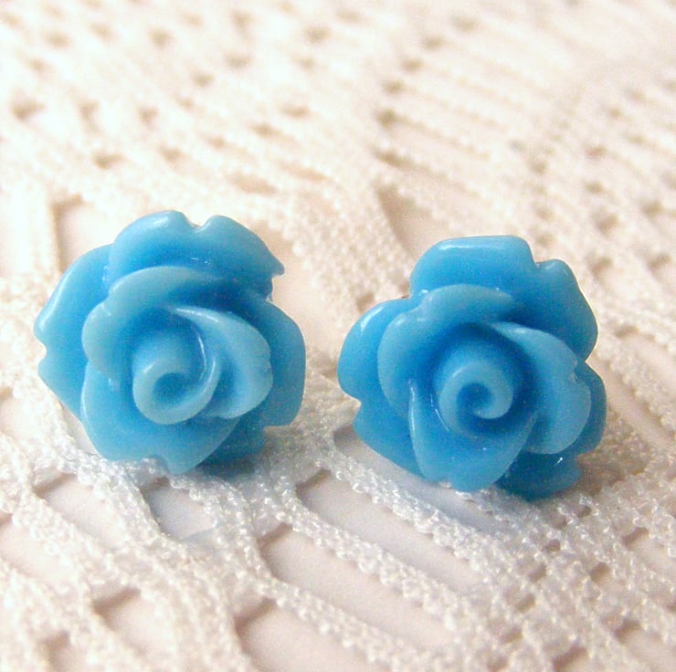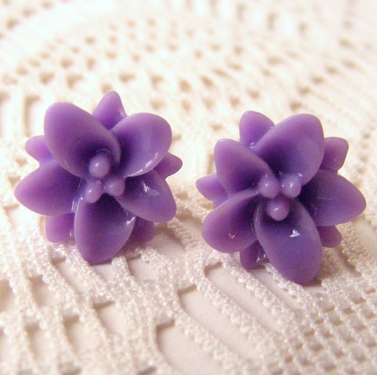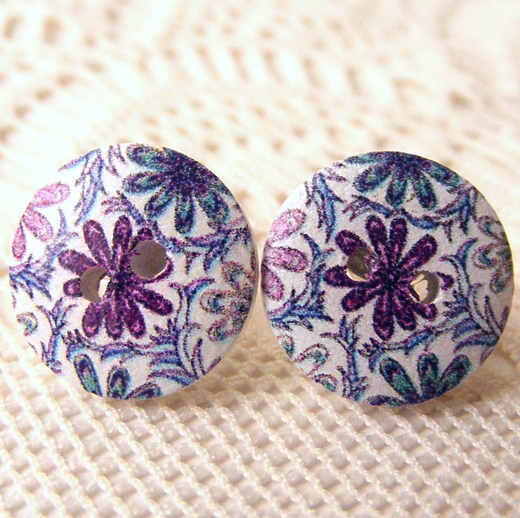 A pretty little trio of stud earrings in blue, purple and white colours. Comprising of blue rose cabochons, purple flower cabochons and wooden buttons with a blue, white and purple flower design all on silver-plated earring posts with butterfly backs. Why have one pair when you can have three!!