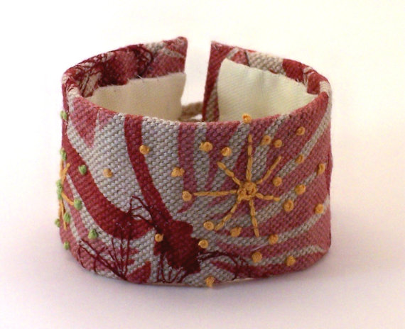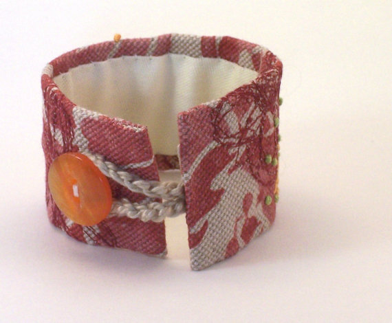 Machine embroidered in deep wine thread. Hand embroidered in egg-yolk yellow and lime green. Orange/yellow button and oatmeal crochet button loop for fastening.