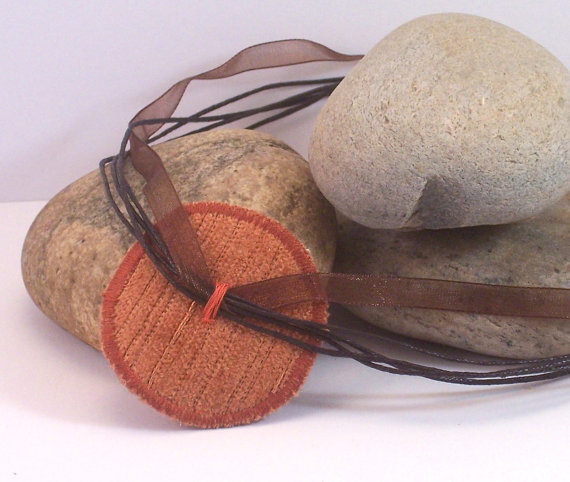 Mercury. Circular (ish) fabric pendant. Pendant is made from mixed textiles with machine embroidery. Stitched onto a ribbon/waxed cotton necklace cord with metal lobster claw fastening.