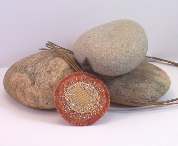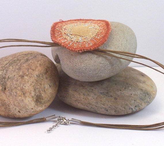 Pendant is a mixture of amber and reds, with machine embroidery in various co-ordinating threads including a metallic silver.