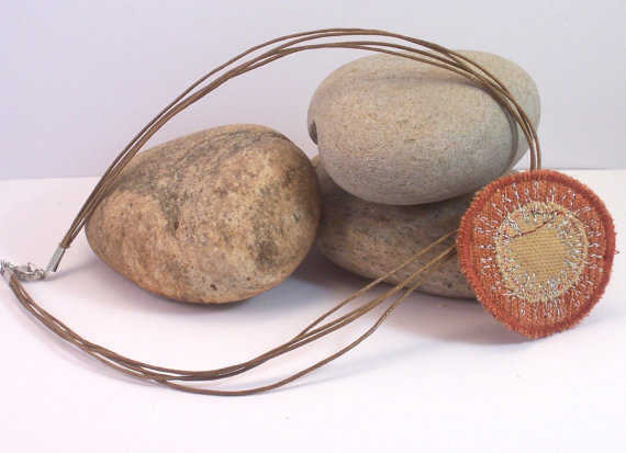 Kalliope. Round fabric pendant. Pendant is made from mixed textiles with machine embroidery. Stitched onto a ribbon/waxed cotton necklace cord with metal lobster claw fastening.