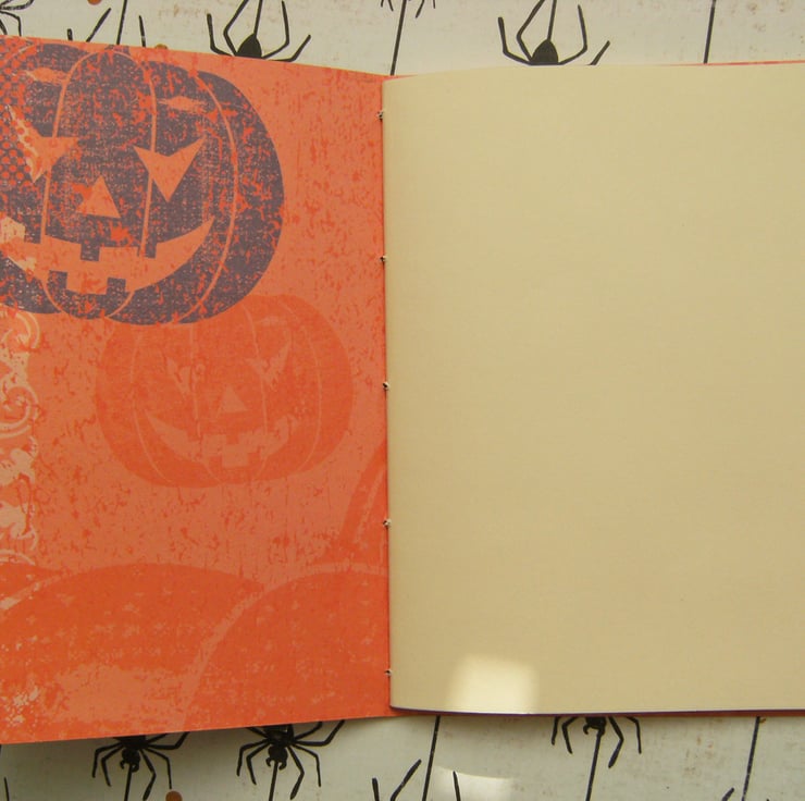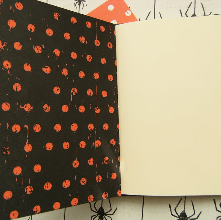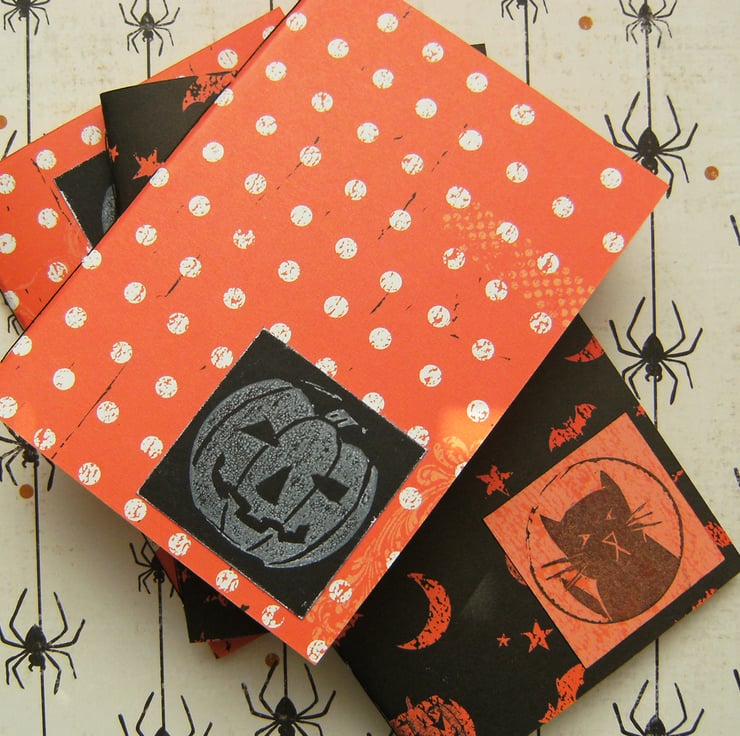 - Each book has a hand printed lino-cut design - one of a ghostly white pumpkin, the other a black cat.