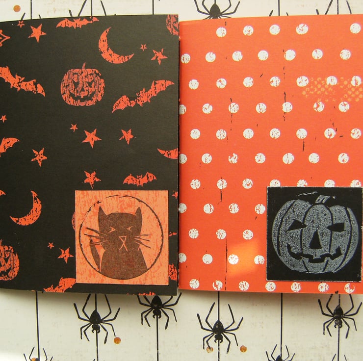 - Each book has a hand printed lino-cut design - one of a ghostly white pumpkin, the other a black cat.