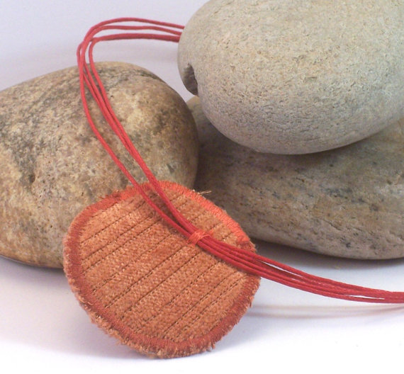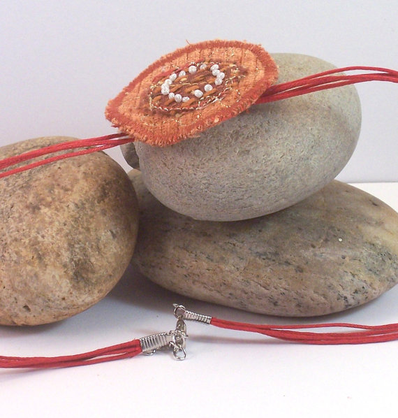 Pendant is a mixture of amber and reds, with machine embroidery in various co-ordinating threads including a metallic gold. Ivory glass beads in centre.
