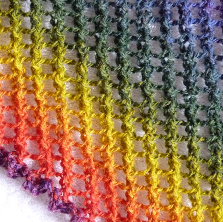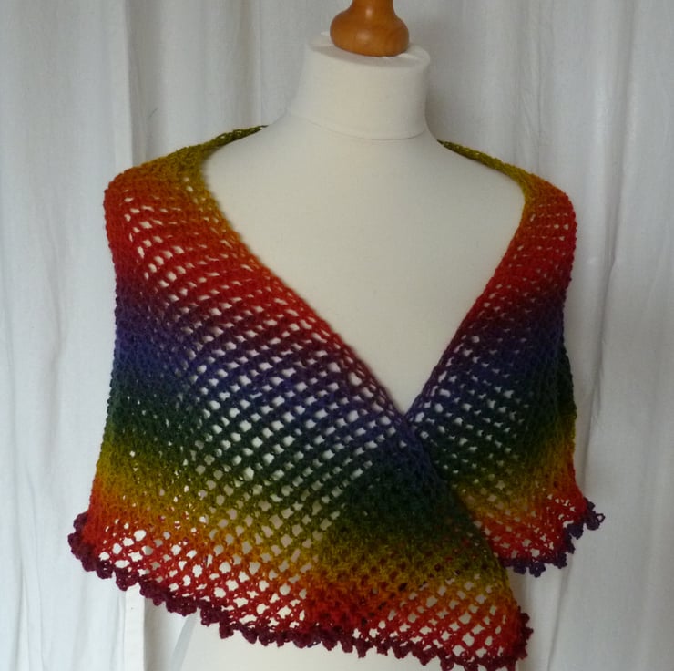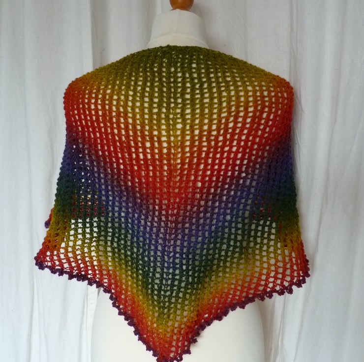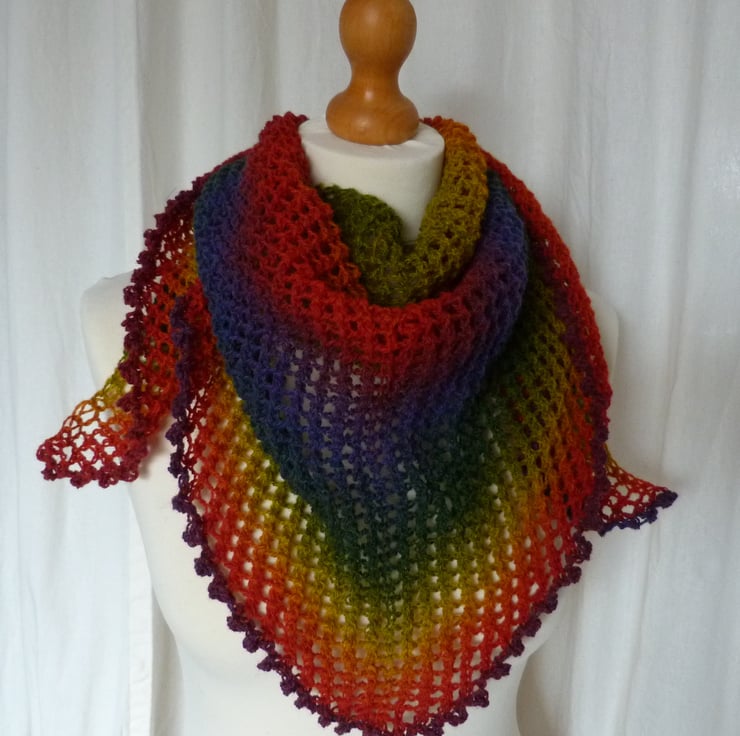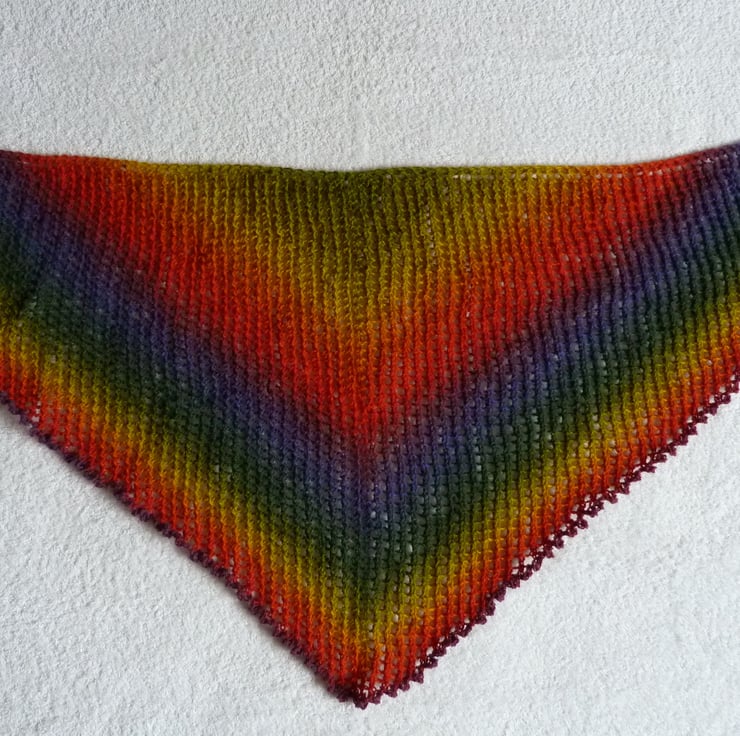 I have hand knit this beautiful rainbow lace scarf in a 4ply pure wool. It is knitted with an all over lace pattern to give a light scarf with a lovely drape, and has a picot edge. It measures 54" point to point, and is 21" deep at the widest part of the triangle.