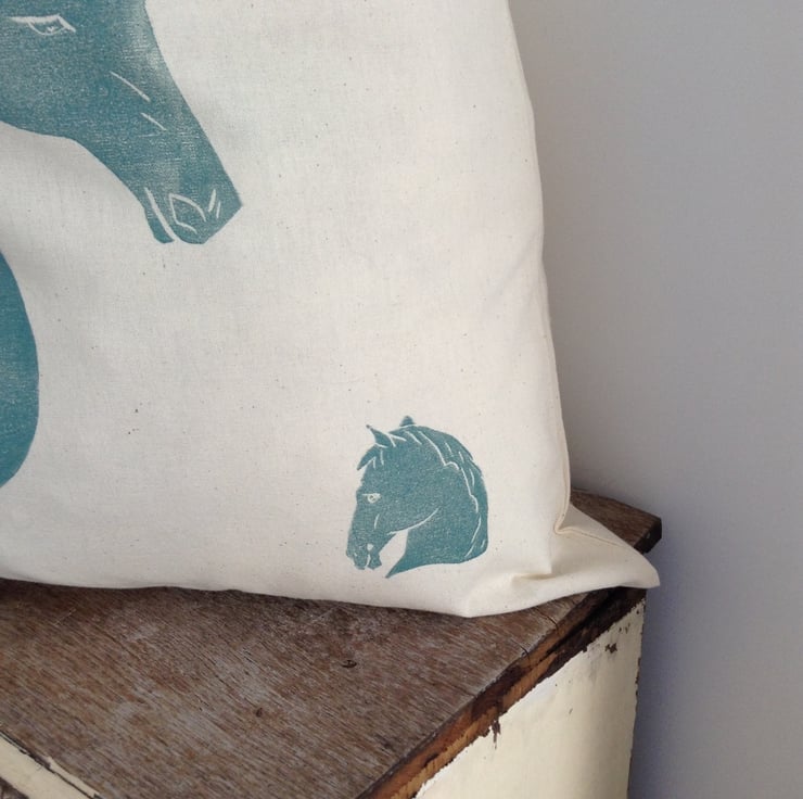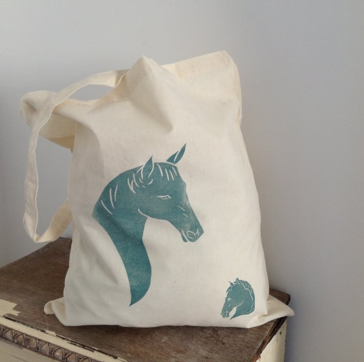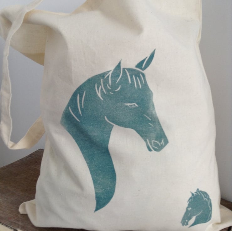 It has a horse portrait Lino printed using linseed oil based inks in the centre and a smaller horse in the corner.