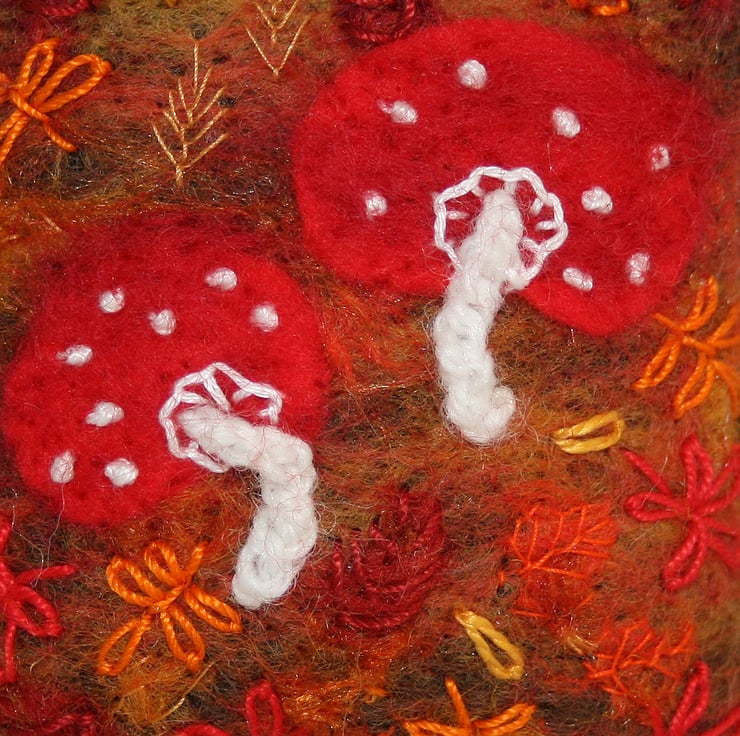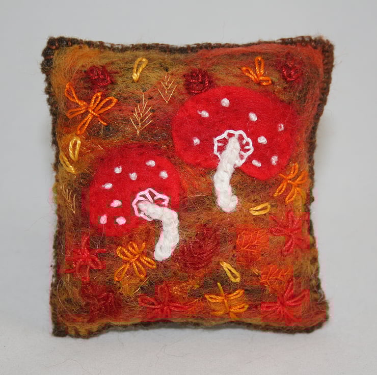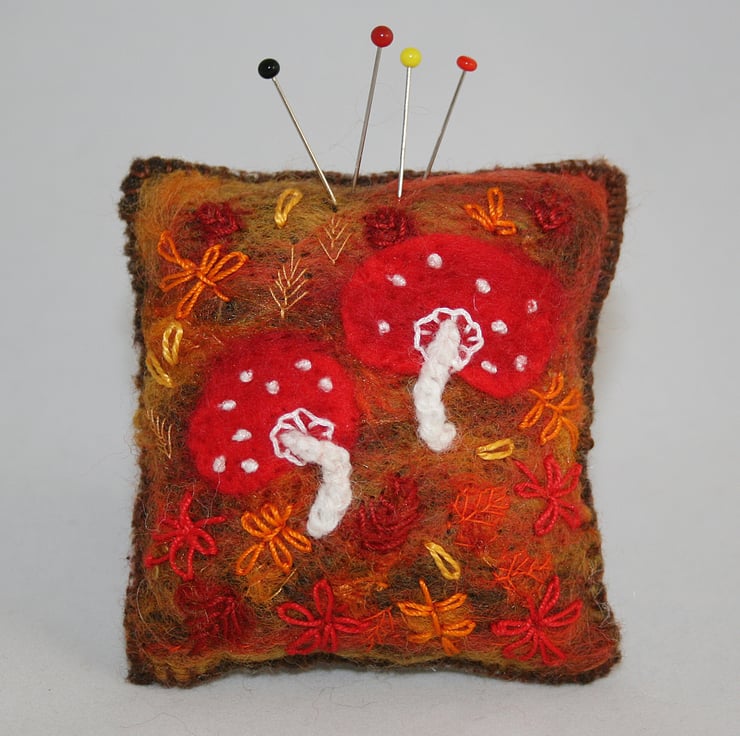 Hand-dyed wool fibers, in a variety of autumnal shades, have been felted to a background of 'eco' felt (produced from recycled plastic bottles). A wide variety of yarn snippets, carefully collected from other yarn projects, have been added to represent patches of fallen leaves. Additional leaves have been hand-embroidered in cotton threads. Two toadstools have been cut from red felt and felted to the background. Red wool fibers have been felted over them to enhance their colour and texture. 'Stalks' have been crocheted in pure white wool and stitched in place. Further details, including the characteristic spots have been added in white cotton. The pincushion is edged in blanket stitch in brown cotton thread.