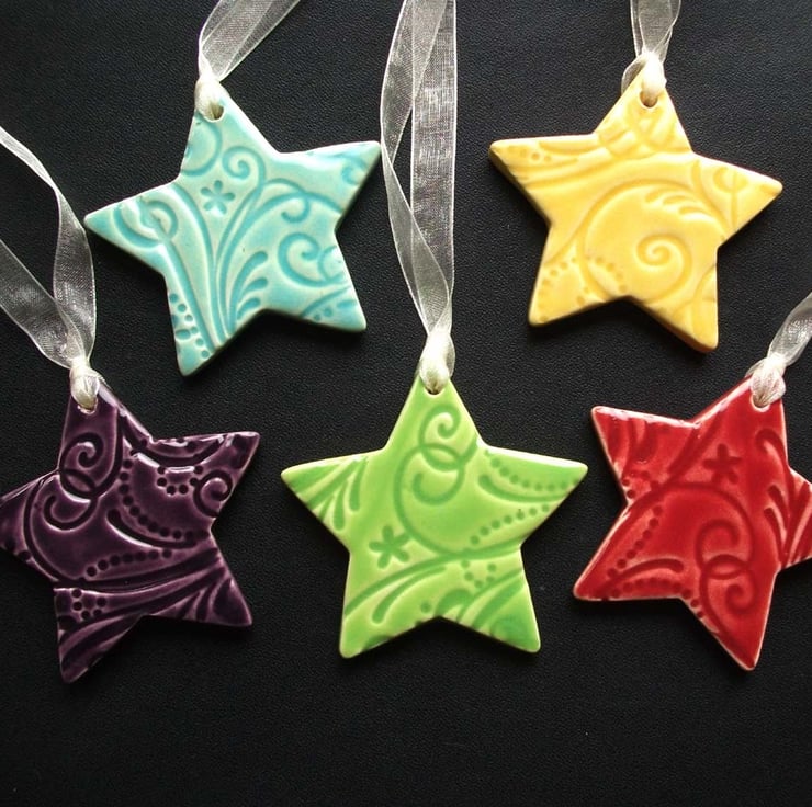 This is a set of 5 ceramic stars are made from white earthenware clay and glazed in a variety of gorgeous bright colours.