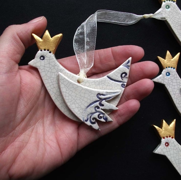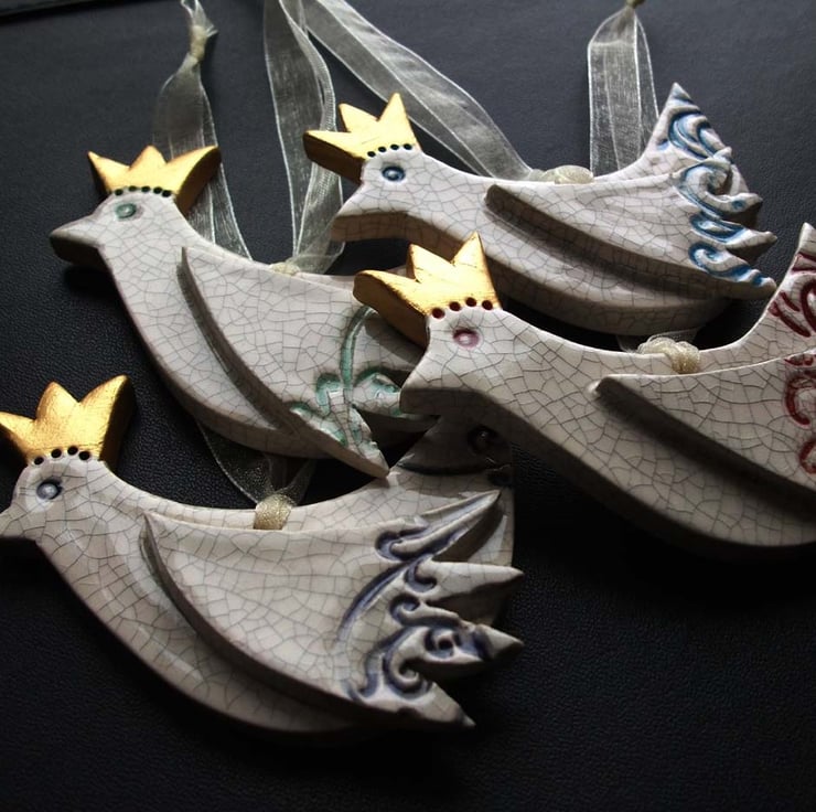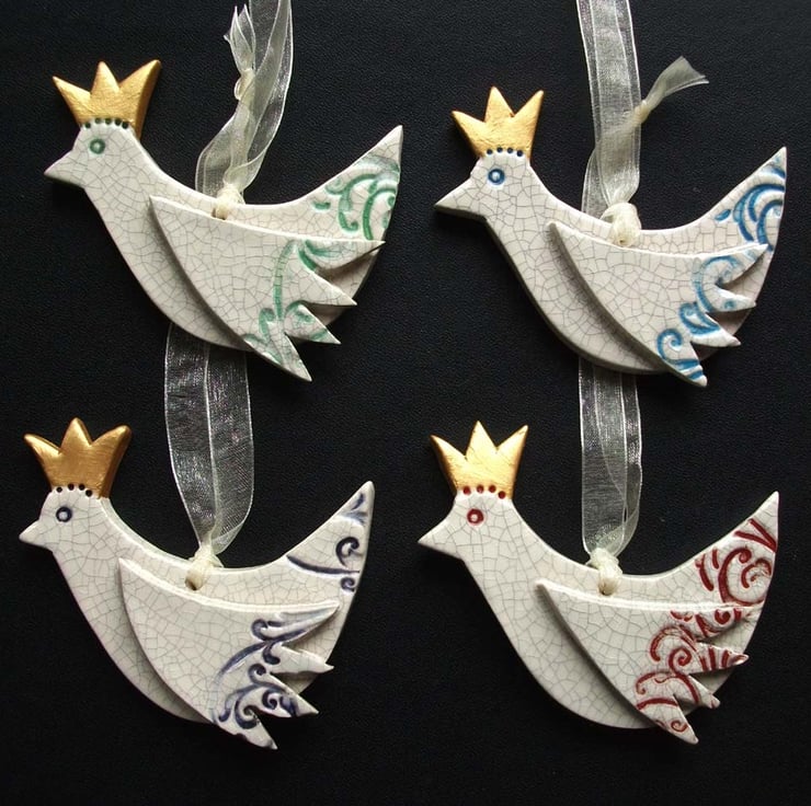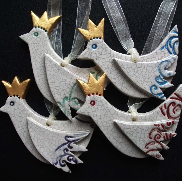 This set of four cute little birds with their golden Xmas hats on are made from white earthenware clay.
